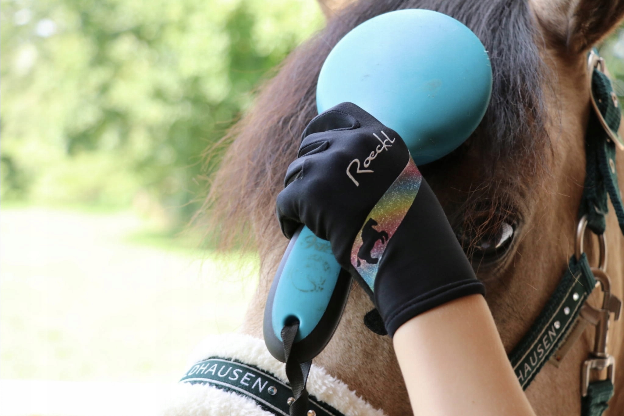 Кріплення на липучках на внутрішній стороні руки гарантує певну та зручну придатність до зап'ястя. Літні кінні рукавички доступні в модному кольорі глибокого рожевого з веселковим поясом, а також у класичному чорному, елегантному гранаді та свіжому білому - усі версії з горизонтальним срібним акцентом.