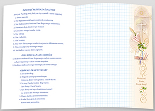 На внутрішній стороні обкладинки вибрані молитви та правила Католицької Церкви з Малого Катехизису.