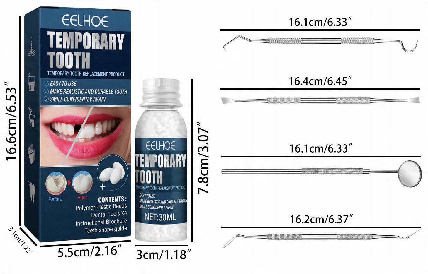 - Просте керування: набір для пломбування зубів простий і зручний у використанні , не потрібні спеціальні інструменти, що дозволяє виготовити новий зуб за кілька хвилин.