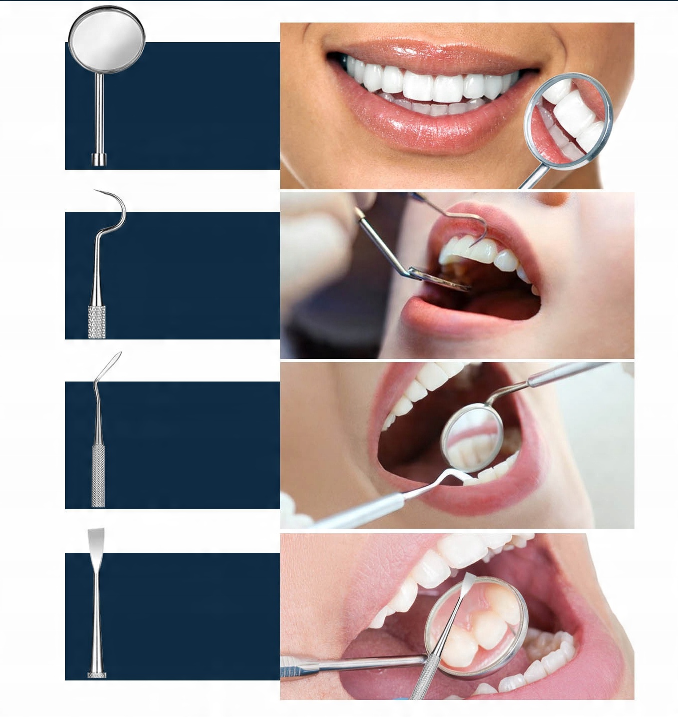 Тимчасовий набір для ремонту зубів, включаючи зубчастий зубний інструмент, дзеркало для деталізації порожнини рота, кутовий зонд і скребок для чищення зубів, достатній для видалення плям у ротовій порожнині на зубах або між зубами для домашнього сімейного використання