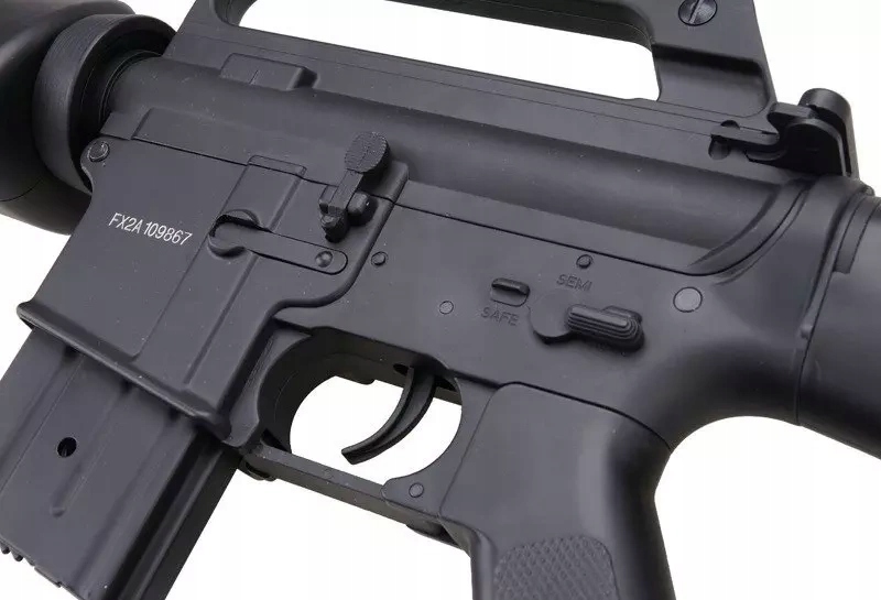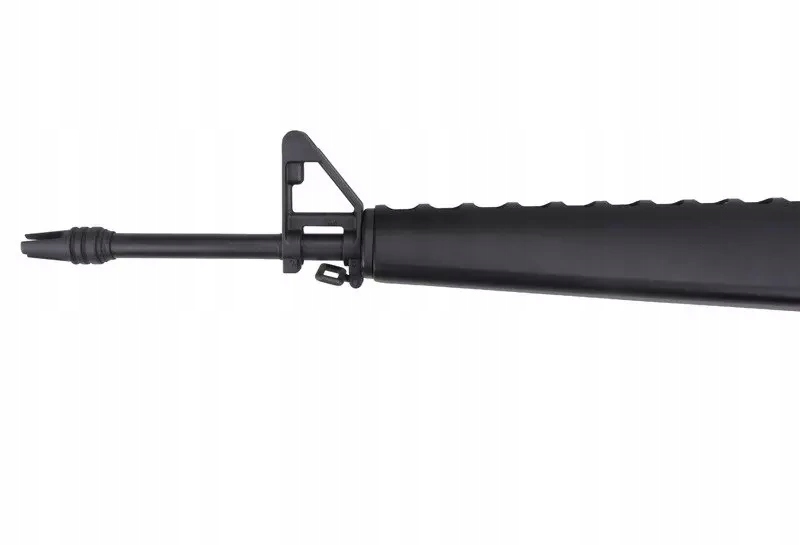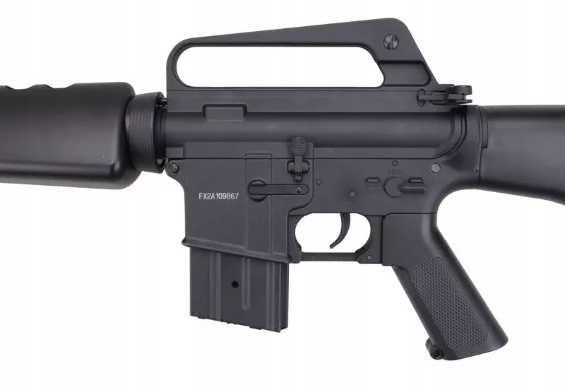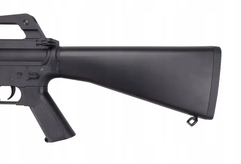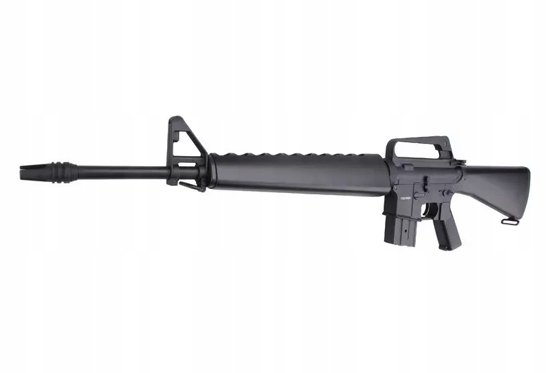 Репліка штурмової гвинтівки, яка знаходиться під час війни у В'єтнамі, стандартна зброя американської армії була виготовлена з металевих елементів та абс. Пластик був виготовлений із зовнішньої обшивки бочки та акумулятора колби. Інші елементи, тобто зовнішня бочка, тіло з транспортним зчепленням та важелем перезавантаження, були виготовлені з металу. Короткий корпус, який часто часто називають "в'єтнамським журналом Hi-Cap (корпус 190 м'ячів), також виготовлений з металу. Довга бочка (510 мм) забезпечує високу точність пострілу, який у поєднанні з початковою швидкістю виходу ~ 400 кадрів в секунду робить цю репліку точною зброєю, ідеально підходить як для першого -брут -штурмора, так і для виборів. Бочка закінчена з лівою ниткою 14 мм, яка дозволяє встановити на ній звуконепроникне. Передня рукоятка, як і транспортне зчеплення, характерна для версії A1. Репліка має армований скелет коробки передач та металевий пружинний направляючий, а також сталеві передачі з вісьмома протиплікованими засувками та підшипником двигуна. Частини JG відомі своєю силою та стійкістю до природного споживання, що значно покращує термін репліки, а також знижує вартість можливої настройки. Також слід зазначити, що репліка оснащена двигуном високого турика, хромованим циліндром та спрямованою головкою поршня, що суттєво впливає на його ефективність та продуктивність.