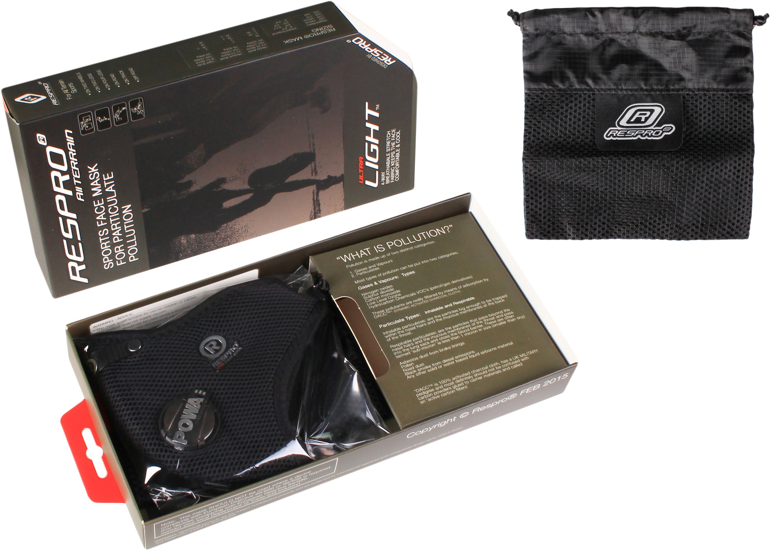Ultralight™ оснащено чорними та сріблястими клапанами Powa™ Elite, міцним носовим затиском і сумкою для транспортування. У масці встановлений спортивний фільтр HEPA-Type™. Це чудовий фільтр, який утримує пил PM2,5, тому він ідеально підходить для використання в міських районах із високим вмістом твердих частинок, що є результатом згоряння дизельного палива, або для подорожей у спекотних і запилених умовах.