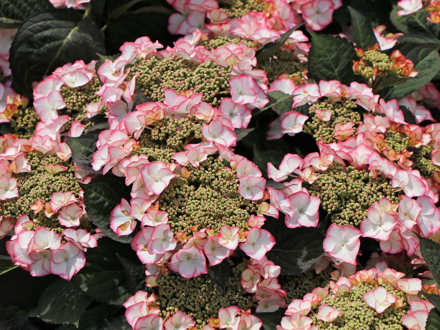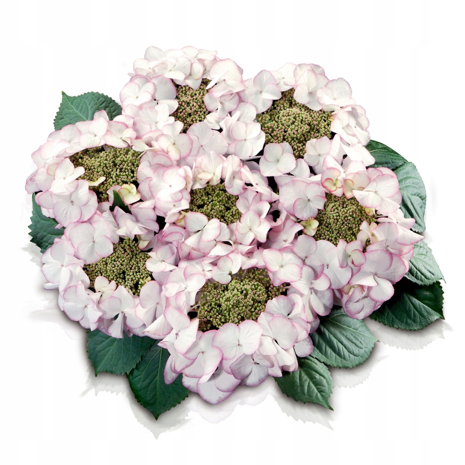 Новий сорт садової гортензії з вигадливими, біло-рожевими, дисковими квітами