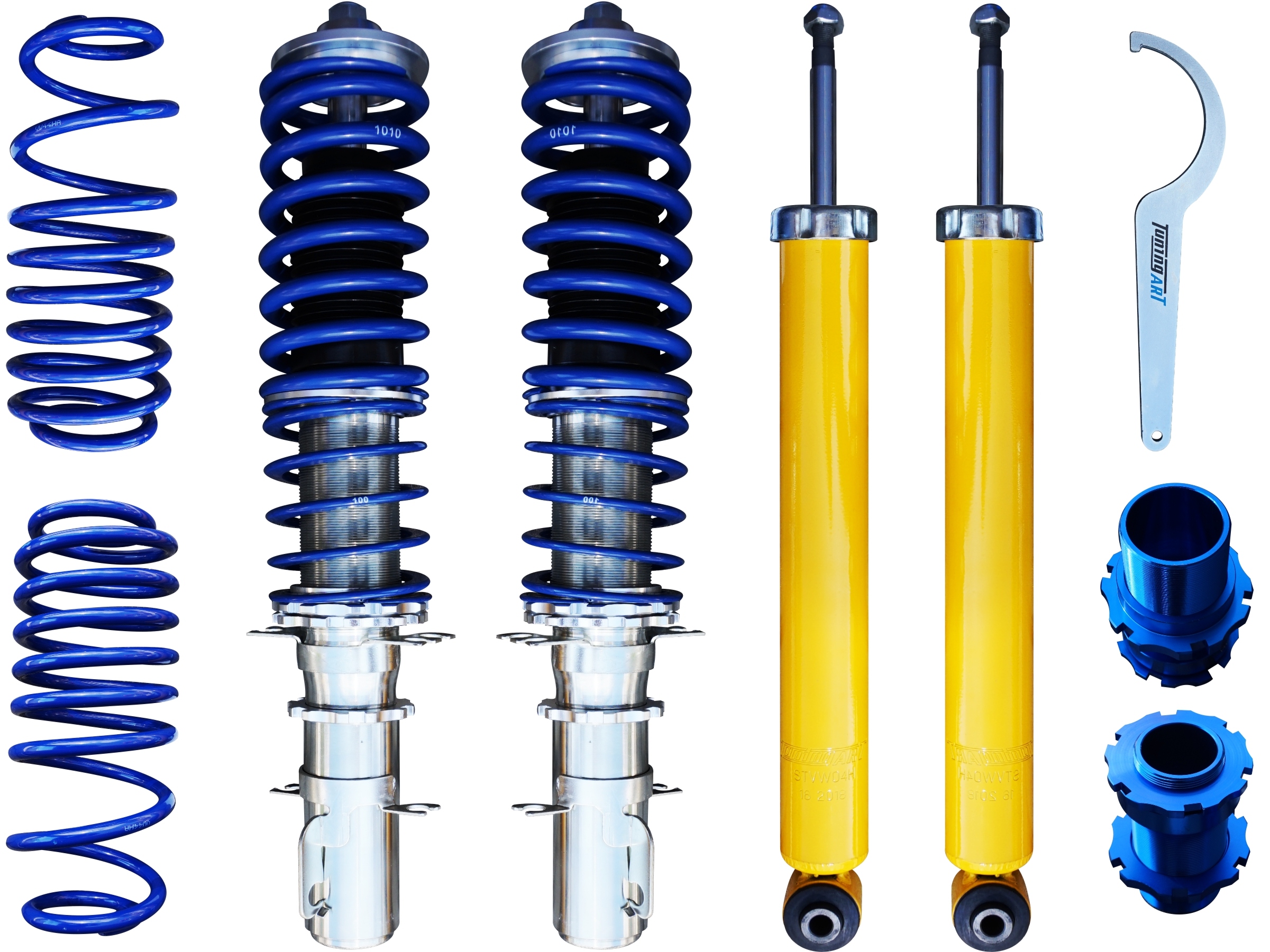 В комплекті 2 різьбових амортизатора, 4 спортивних пружини, задні амортизатори, регулювання заднього ходу рукава, ключ регулювання висоти та сертифікат TUV