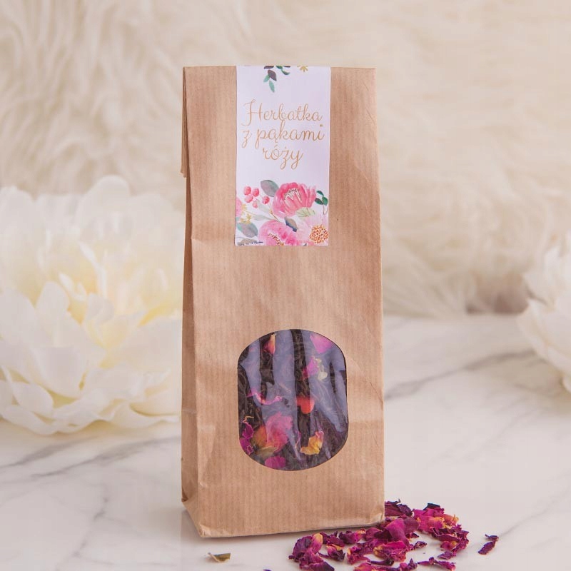 - склад: новорічний подарунок у подарунковій коробці з цупкого рожевого картону, в коробці красиво підібрані інгредієнти з зображенням рожевих квітів: ароматний чай із бутонами троянд у крафтовій упаковці (50 г), скляний флакон наповнений з їстівними пелюстками троянд, скляним флаконом з сіллю для ванн, баночкою багатоквіткового меду з польської пасіки (50 г), баночкою з порошковими льодяниками (50 г), фруктовими цукерками з мотивом серця; коробка обшита натуральною деревною вовною, на кришці є наклейка з графікою, різдвяними побажаннями та особистим підписом