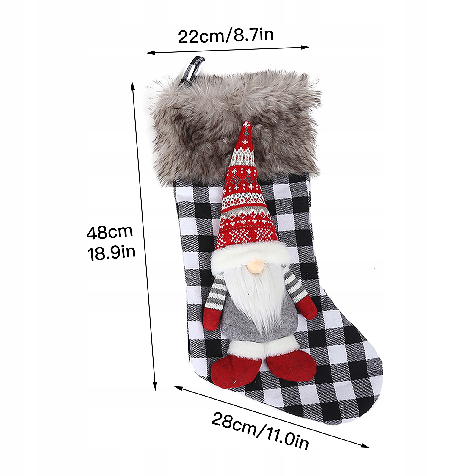 2. Класичний стиль: лялька Gnome з високою шапкою прикрашена панчохом, оснащеною короткими плюшевими та класичними плед -візерунками, ідеальною різдвяною прикрасою, новим роком вдома, рестораном, клубом, баром. Розмістіть ретельно відібрані подарунки для сім'ї та дітей. Вони, безумовно, виглядатимуть чудово висіли на ялиці.