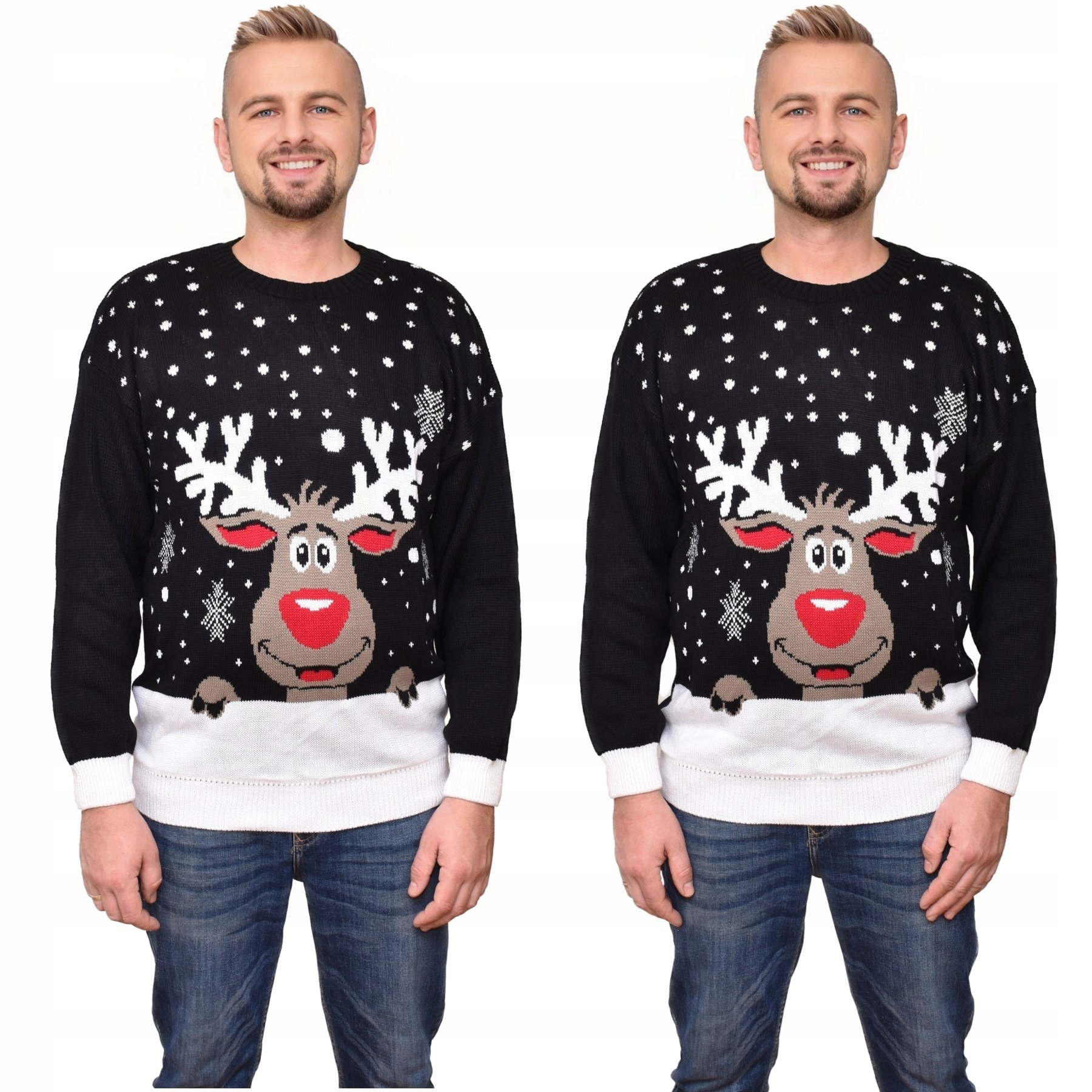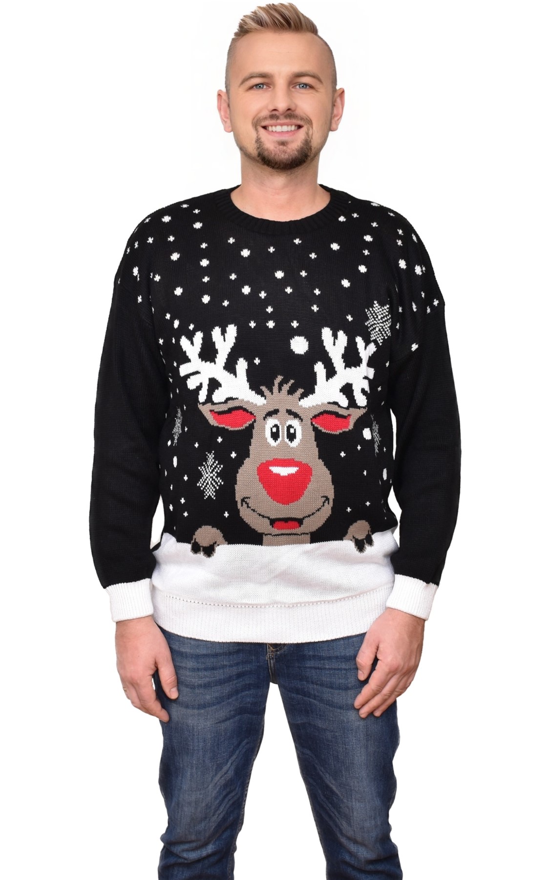 Чорний светр із зображенням кумедного оленя Рудольфа з червоний ніс. Білі сніжинки на светрі. Гладкі рукава і спинка. Білі манжети на рукавах і внизу светра.