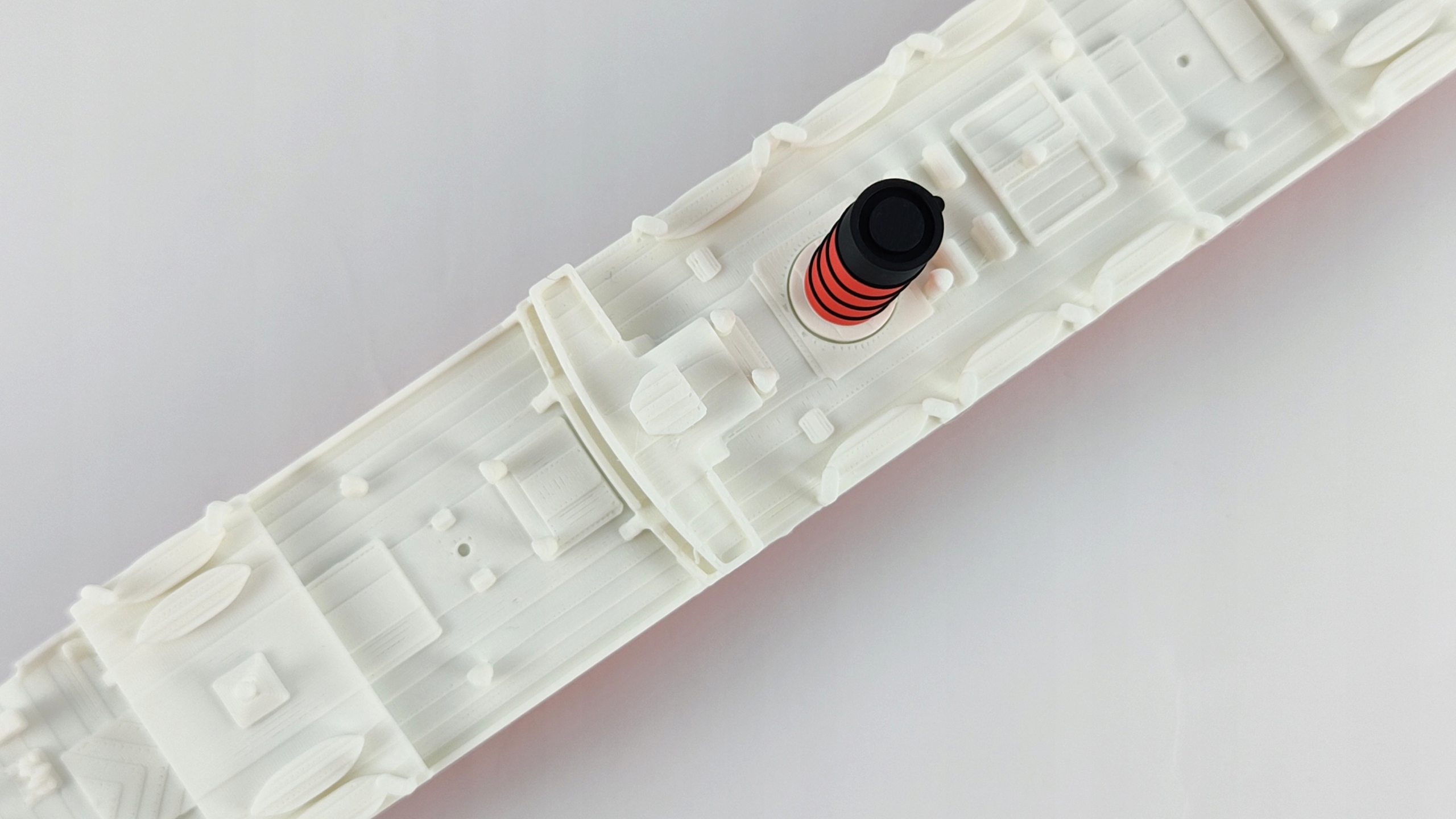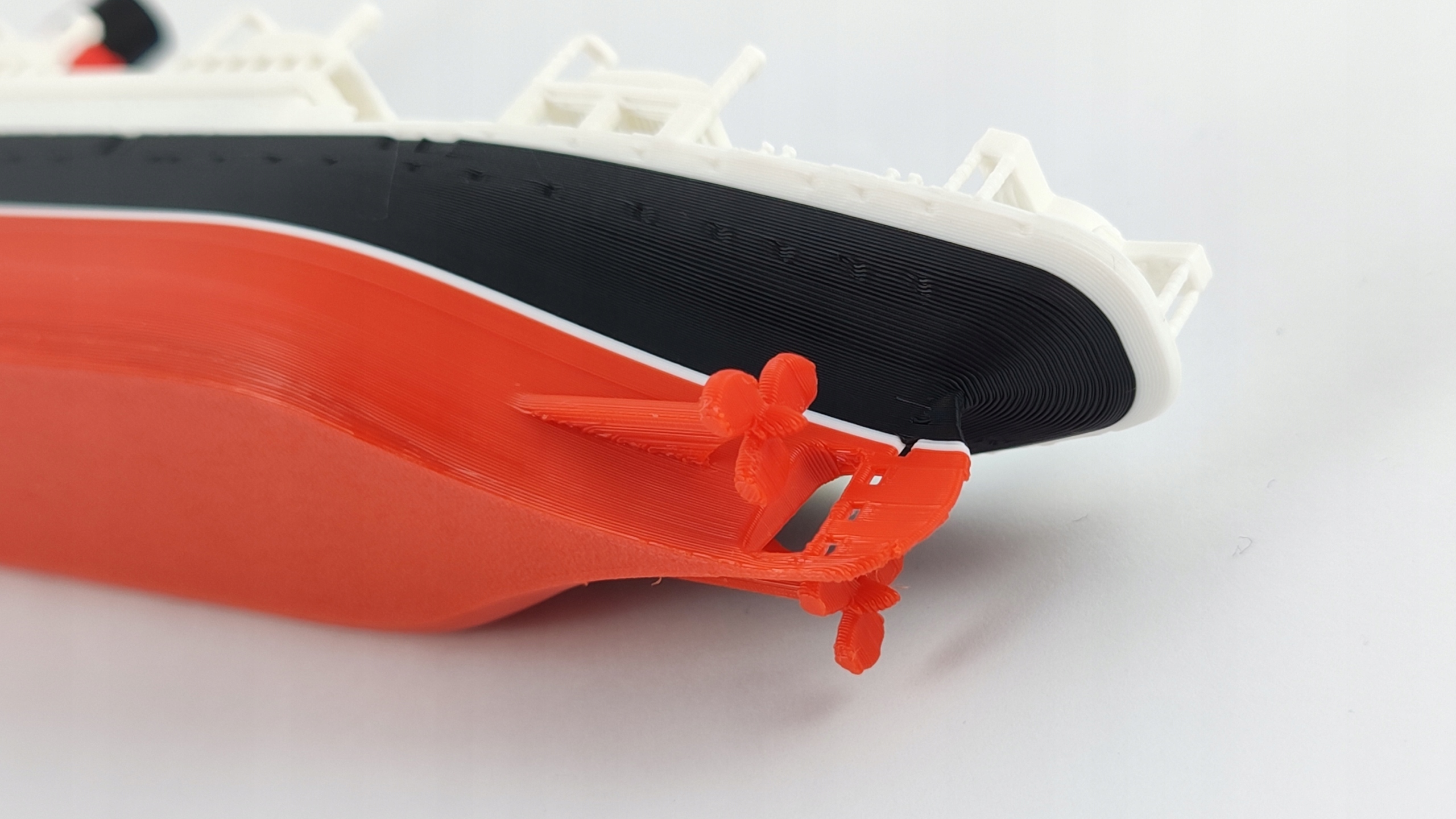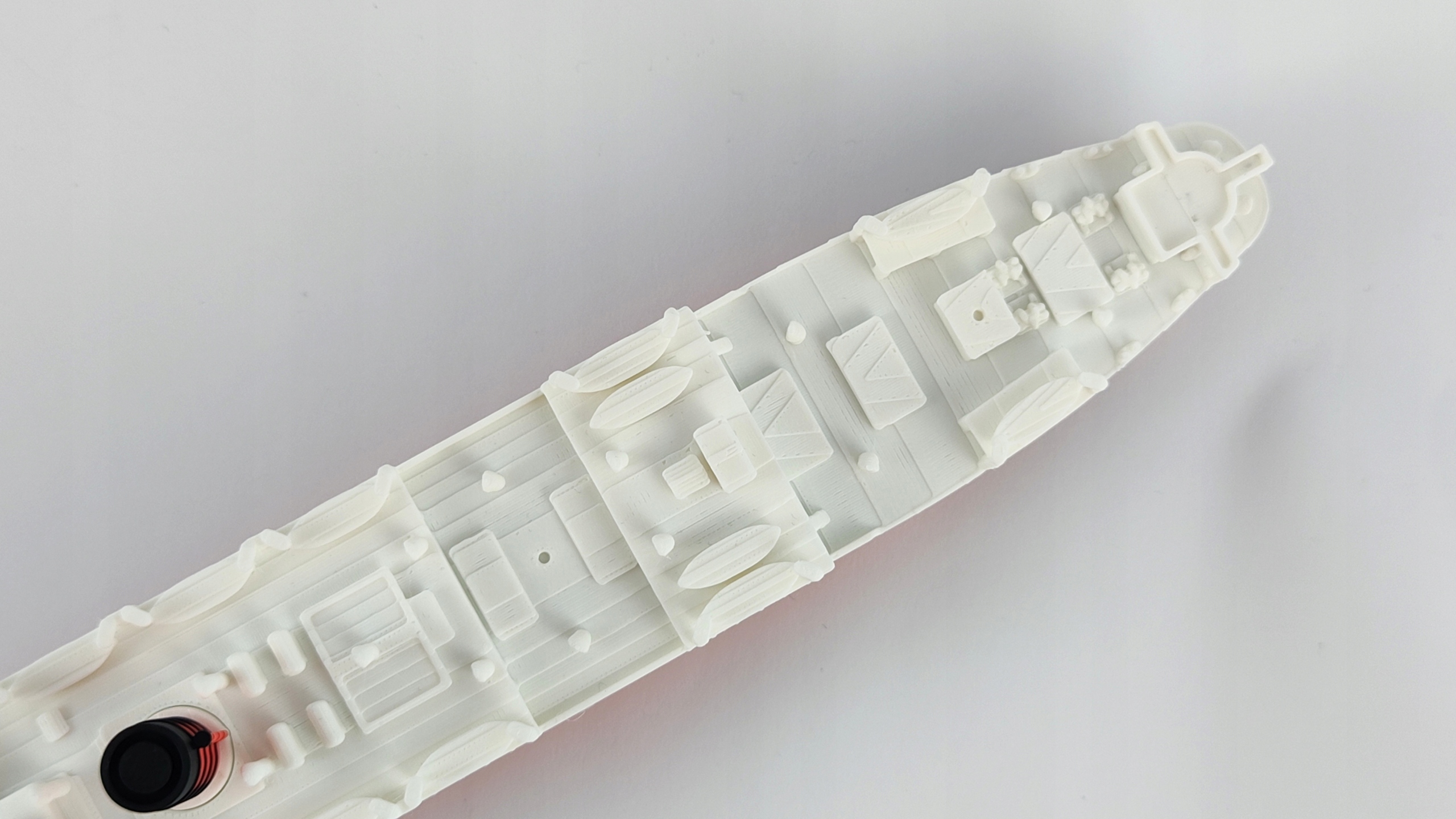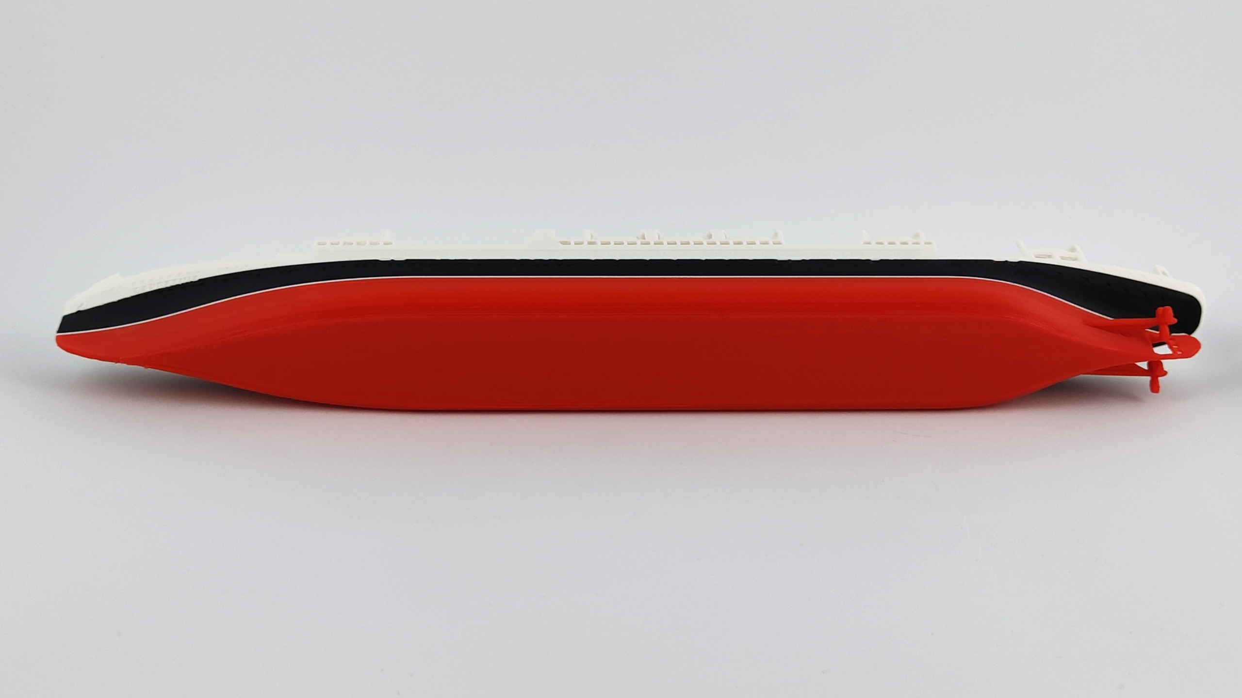 Модель, зроблена в технології 3D -друку, за вражаючою шкалою 1: 200 відтворює характерний силует корабля, підтримуючи його пропорції та кольори.