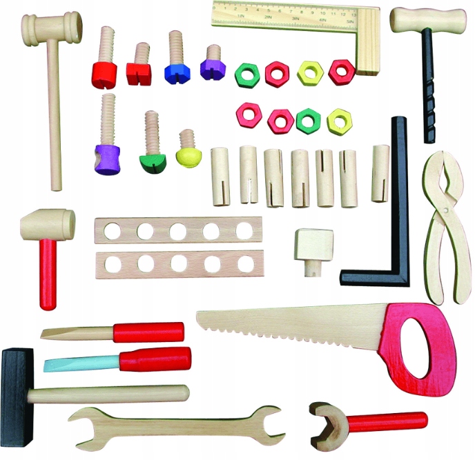 Ідеальне місце для гри маленьких майстрів! Майстерня з багатим обладнанням сприяє творчості та розвитку моторики. Велика робоча поверхня має отвори, в які можна вкручувати шурупи. Окрім лещат, дерев’яний верстаковий набір містить багато інструментів, таких як молоток, пила, викрутка та достатньо гвинтів і гайок. Три вбудовані висувні ящики та велика полиця також пропонують місце для різного посуду. Цей великий верстак був розроблений у Німеччині відповідно до європейського стандарту безпеки іграшок EN 71 і рекомендований з 3 років. Всі використовувані матеріали пройшли перевірку на наявність шкідливих речовин і сертифіковані. Крім того, набір має знак якості EPH Інституту технології деревини. Лак стійкий до слини та безпечний для шкіри.