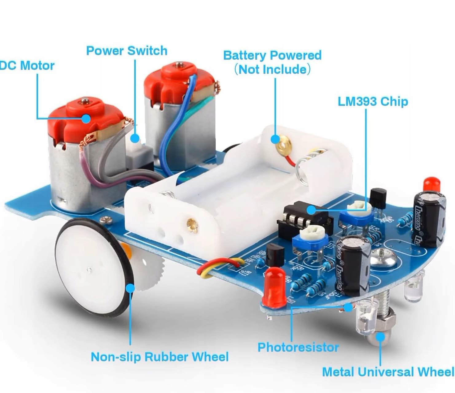 Після належного складання робот рухається за чорною лінією на землі. Система працює завдяки світлодіодному та фоторезистолу. Чотири типи резисторів необхідно розпізнати за допомогою маркування смуг, схема.