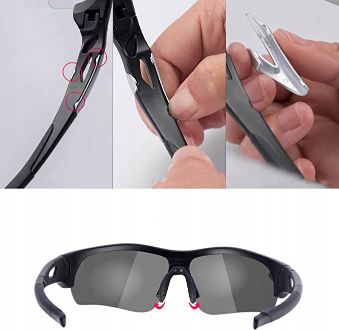 - Окуляри мають три пари змінних застібок оправи - чорні, сріблясті та червоні.
