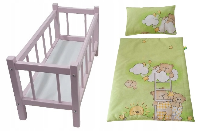 рожеве дерев’яне ліжечко з набором постільної білизни