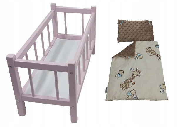 Рожеве дерев’яне ліжко + 3-елементна постільна білизна для ляльок
