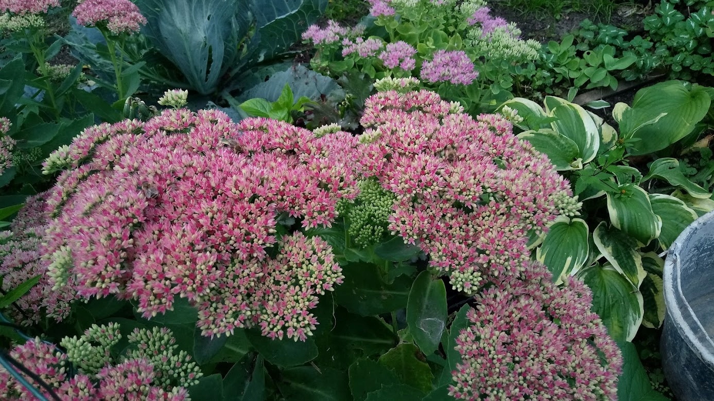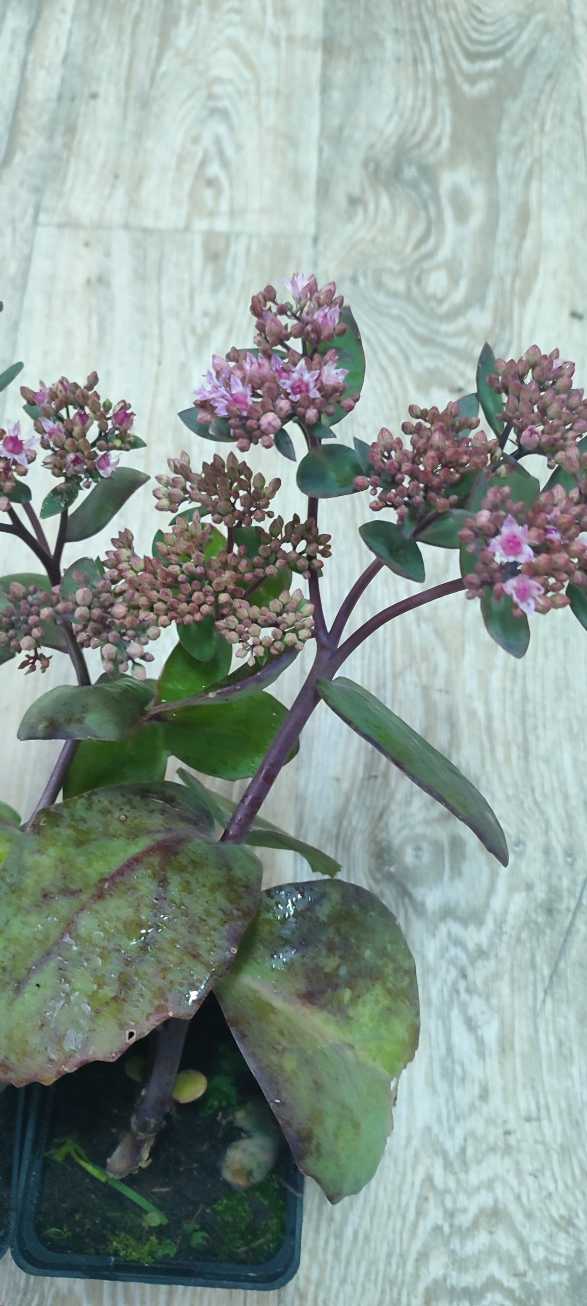 І стебла, і листя вкриті товстим шаром воску. У липні-серпні на верхівках пагонів утворюються суцвіття у вигляді плоских зонтиків. Окремі квітки дрібні, рожеві, але дуже численні. Розвиваються з серпня по вересень. Під час цвітіння вони приваблюють численних комах, у тому числі різнокольорових метеликів.