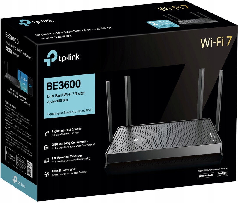 TP-Link Archer BE3600-це сучасний маршрутизатор з технологією Wi-Fi 7. Маршрутизатор оснащений двома портами 2,5 ГБ/с та трьома портами 1 ГБ/с, що забезпечує підтримку багаторазових з'єднань. Завдяки чотирьох зовнішніх антенах та технології формування променів Archer BE3600 пропонує більший діапазон та сильніший сигнал. Це можна легко налаштувати за допомогою програми TeTher TP-Link та використовуйте функцію домашнього поля, які забезпечують підвищений захист від кібер-ниток.