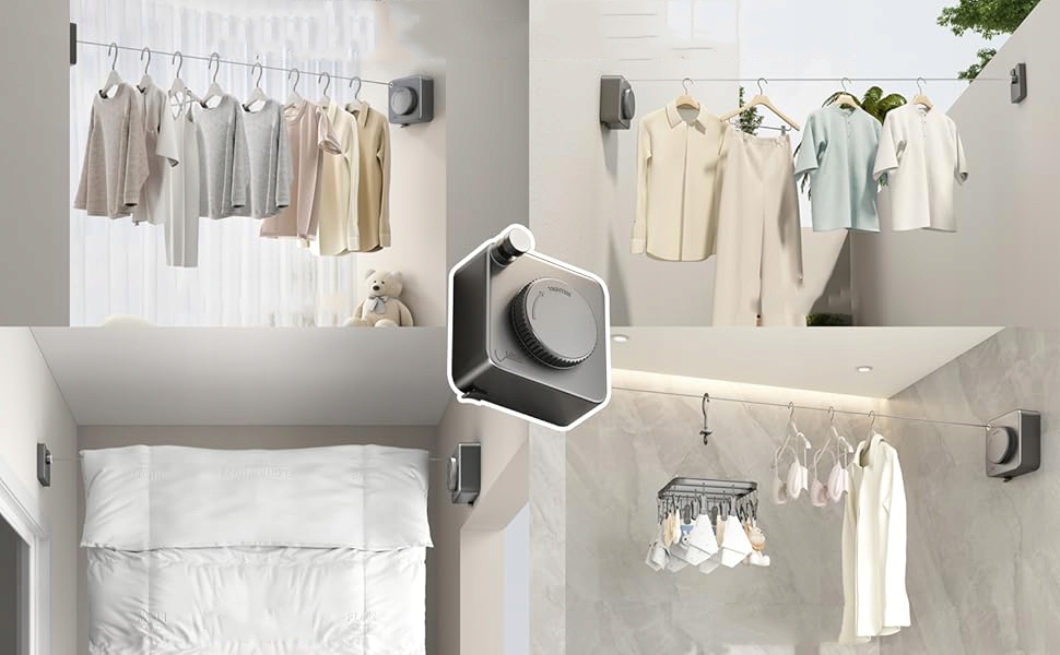 4 , що забезпечує достатньо місця, щоб повісити одяг, шкарпетки, ковдри тощо Ця мотузка для нижньої білизни також може зберегти вагу до 40 фунтів, Отже, вам не доведеться турбуватися, що висячий одяг буде занадто важким і призведе до того, що струна відвалиться. Бо нижню білизну можна віддати, коли вона не потрібна, вона дуже мала і не займає місце, ви навіть забудете, що у вас є струна для нижньої білизни. витягніть його і повісіть на гачок, коли це потрібно для його використання.