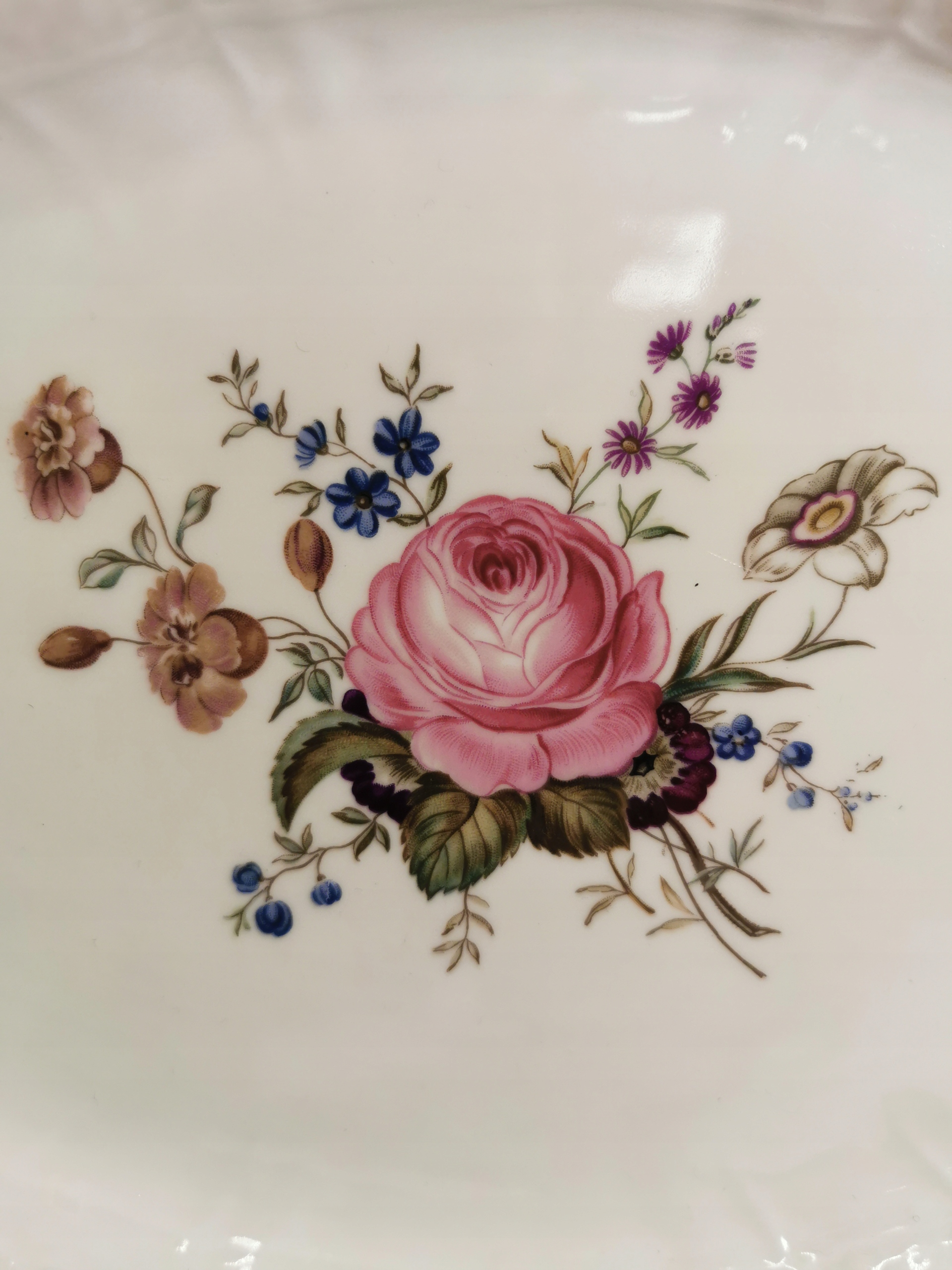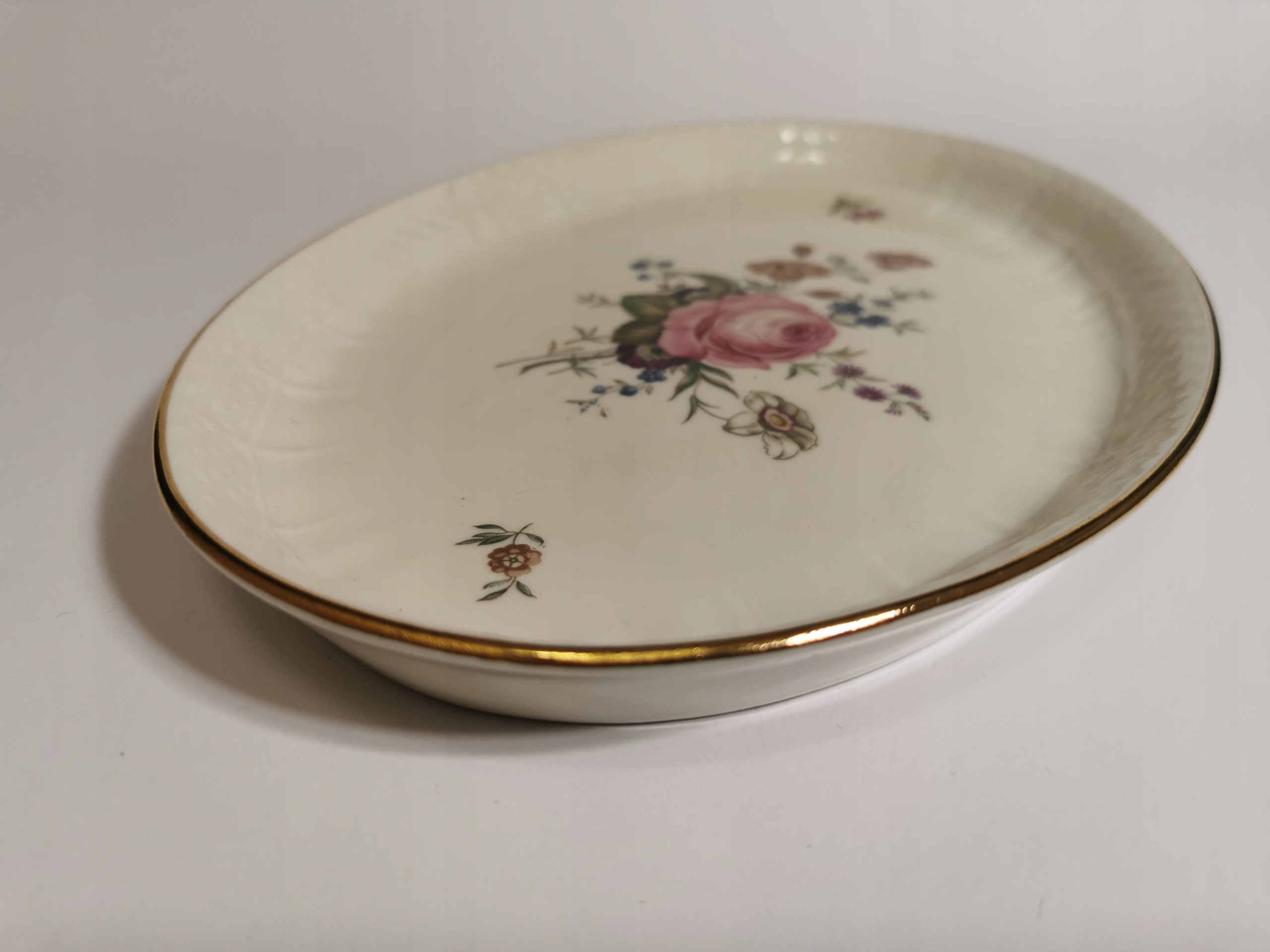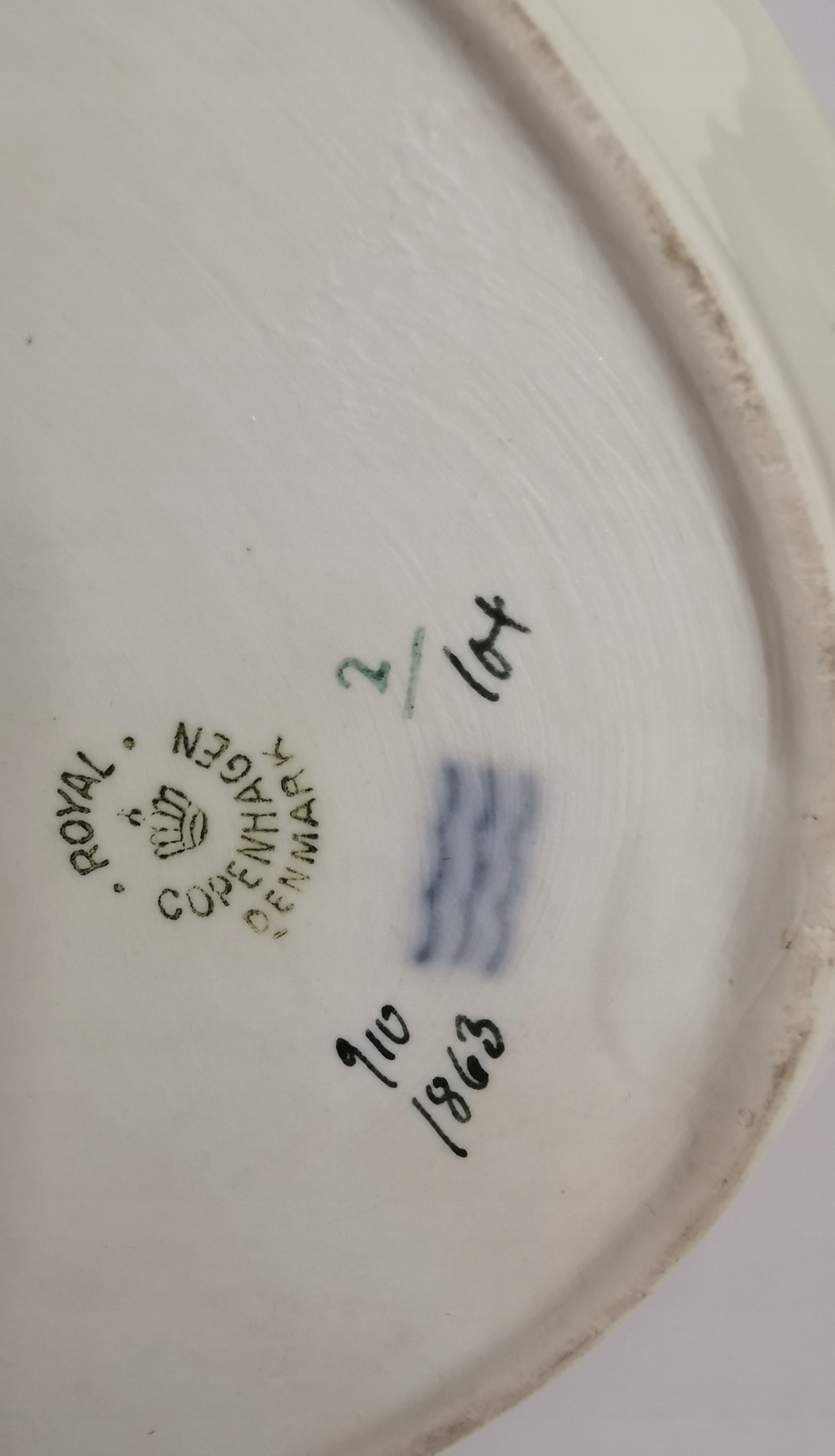 Представляємо гарну овальну тарілку від фабрики Royal Copenhagen. Тарілка виготовлена з порцеляни кольору екрю з чарівним рельєфним декором у вигляді кошика. На дні посудини є підпис, який свідчить про те, що плита була виготовлена приблизно в 1944 році.