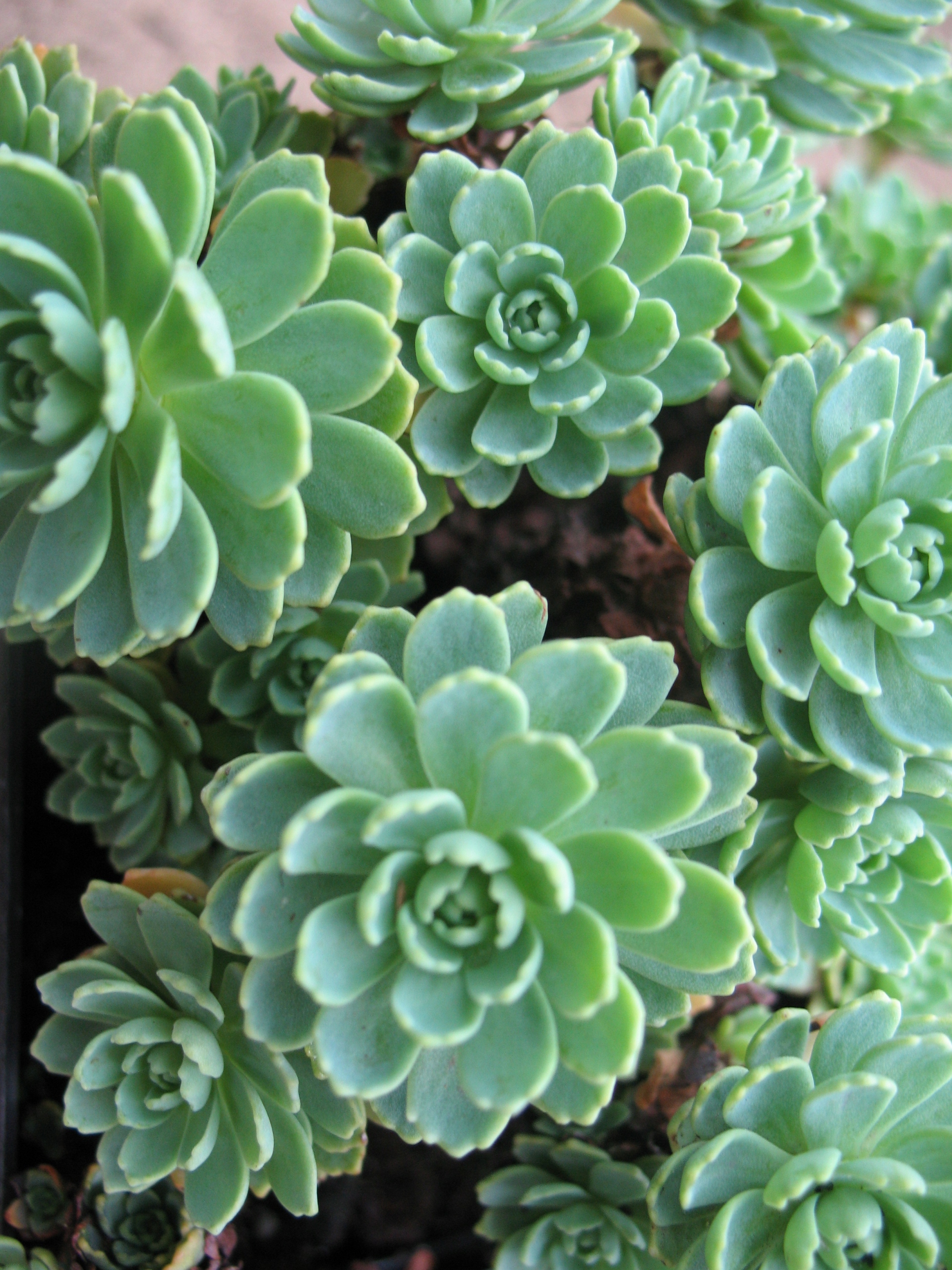 Це довга стерма рослина з характерними розетками, що нагадують трояндові квіти. Це вічнозелений вид, тобто листя залишається живим на рослині взимку. Сидячі листя, в розетках із синім зеленим кольором. Вершкові -білі квіти з невеликими декоративними цінностями. Він цвіте в IV.