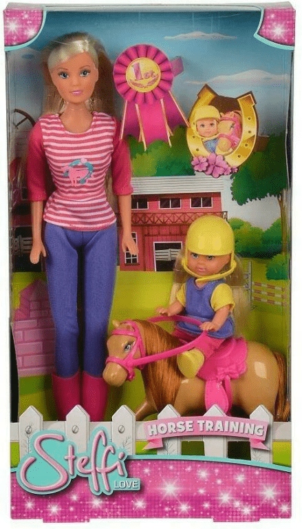 ляльки Стеффі та Еві на тренуванні на конях, в кінних костюмах. У наборі було додано поні.
