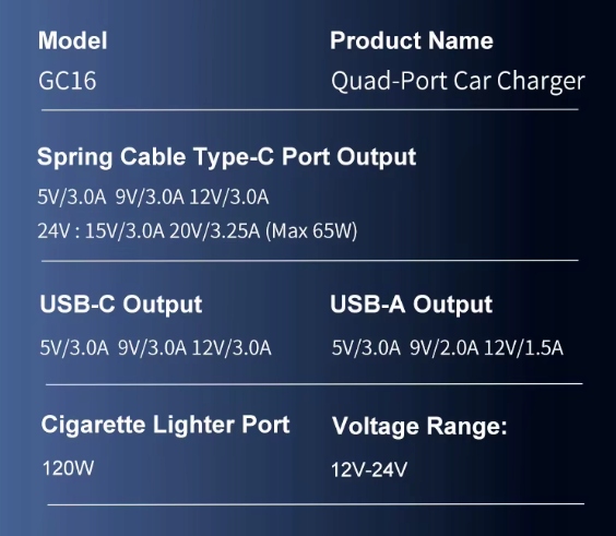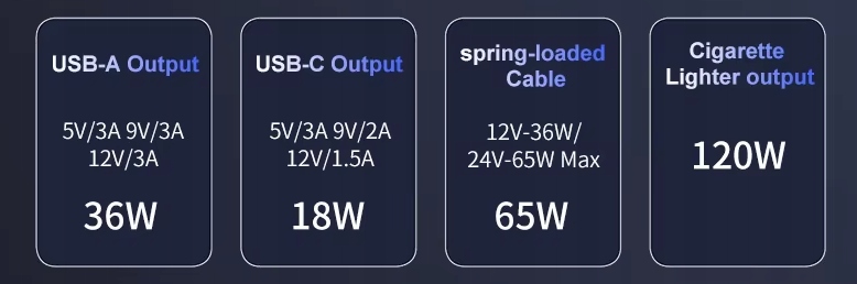 Цей сучасний автомобільний зарядний пристрій - це реальний центр електроенергії, який заповнює ваші вимоги на маршруті. Оснащений USB-A (36W) , USB-C (18W) , пружинний кабель 65 Вт (лише 24 В!) і 120 Вт легший розетка , забезпечує миттєве та безпечне зарядку багатьох пристроїв одночасно.