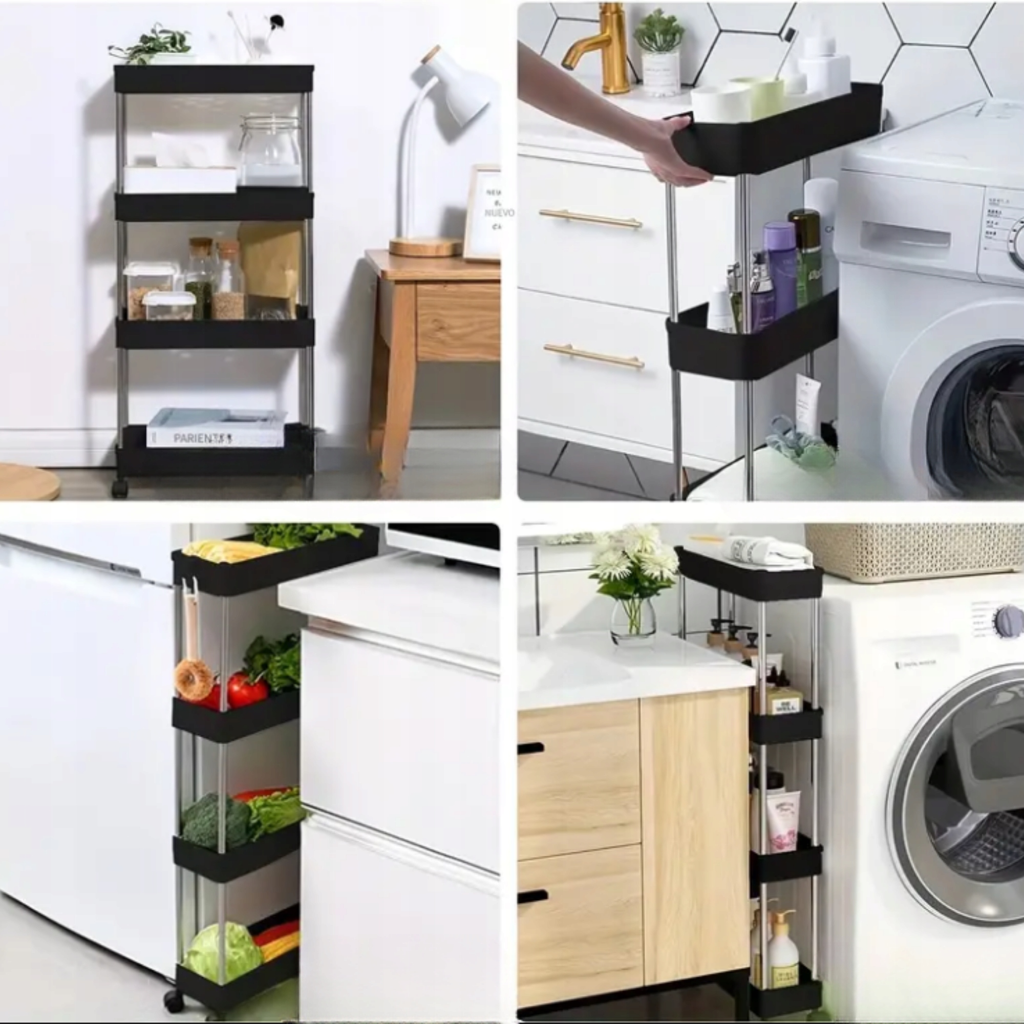 Мобільна полиця чорного кольору на колесах — це просте та практичне доповнення до вашого дому! Це дозволить організувати простір і заощадити місце в шафах. Він підійде в будь-якій кімнаті, де вам потрібен додатковий простір, завдяки своєму естетичному вигляду ви можете розмістити його на кухні, у вітальні, спальні або ванній кімнаті, він також ідеально підходить для салону краси. Відкриті полиці дадуть вам швидкий доступ до необхідних речей, а коліщатка дозволять легко змінити їх місце, без зайвого застосування сили!