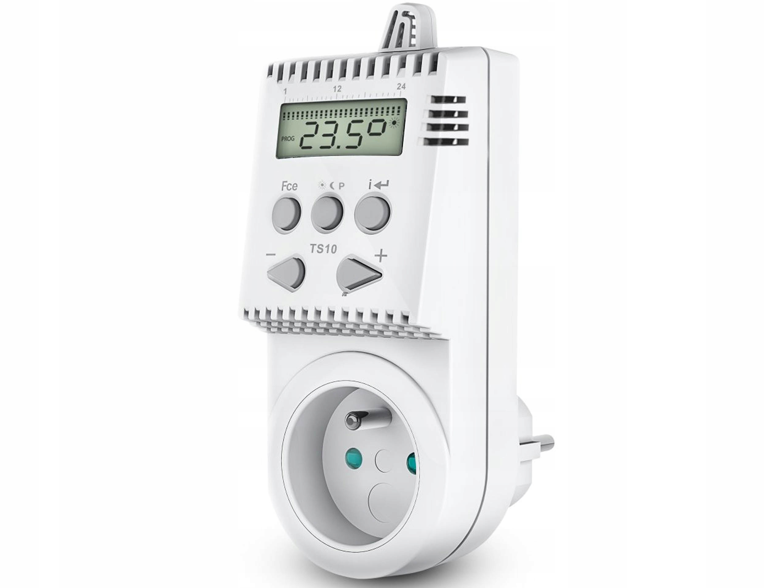 Розетковий термостат TS10 з тижневим програмуванням для електронагрівальних приладів, завдяки якому можна керувати, серед іншого: інфрачервоними панелями, інфрачервоними обігрівачами, нагрівальними панелями, конвекторами тощо. Автоматичне регулювання температури дозволяє заощадити до 30% енергії. Для використання вдома, в офісі тощо. Адаптований до 4 змін температури протягом дня.
