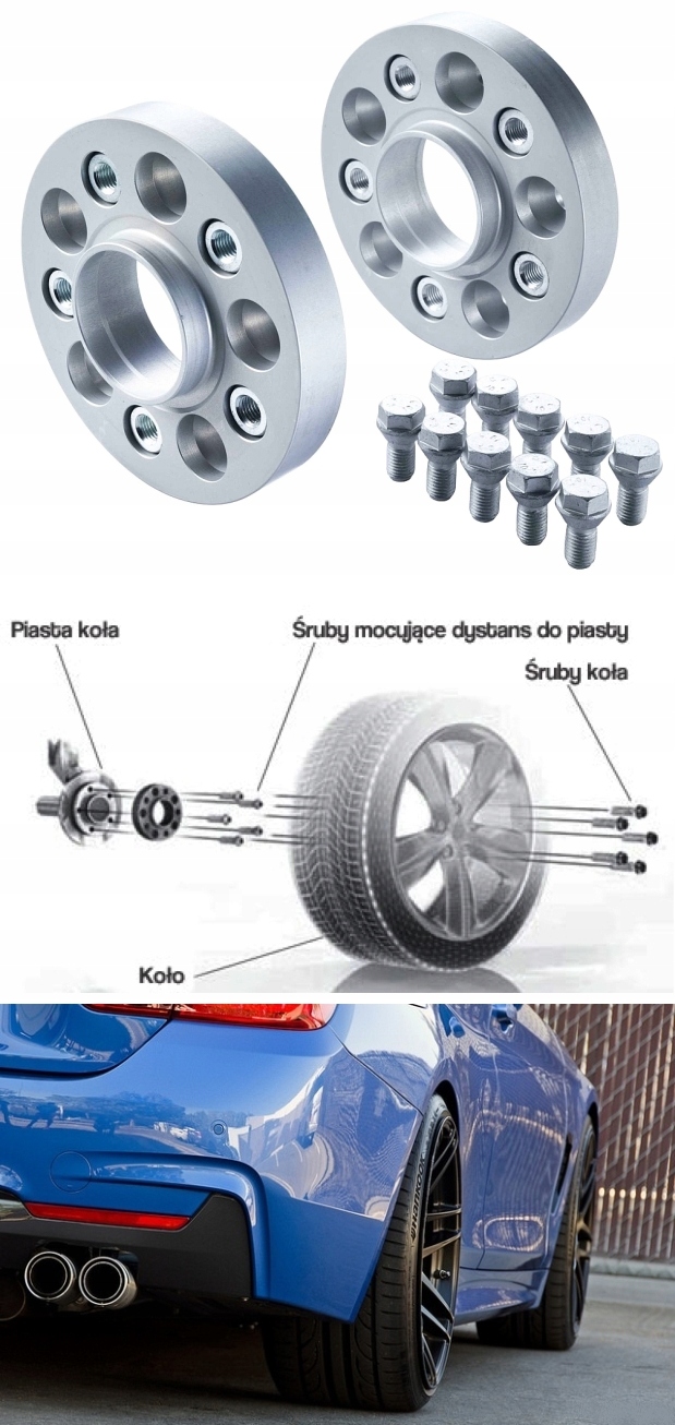 Оригінальні розпірки осі з гвинтами. Високоякісний продукт, виготовлений в Німеччині з міцного, міцного дюралюмінієвого сплаву. Збільшена колія коліс і набагато кращий зовнішній вигляд автомобіля - лише деякі з переваг прокладок, також значно покращується зчеплення автомобіля з дорогою на поворотах, встановлення не викликає жодних проблем.