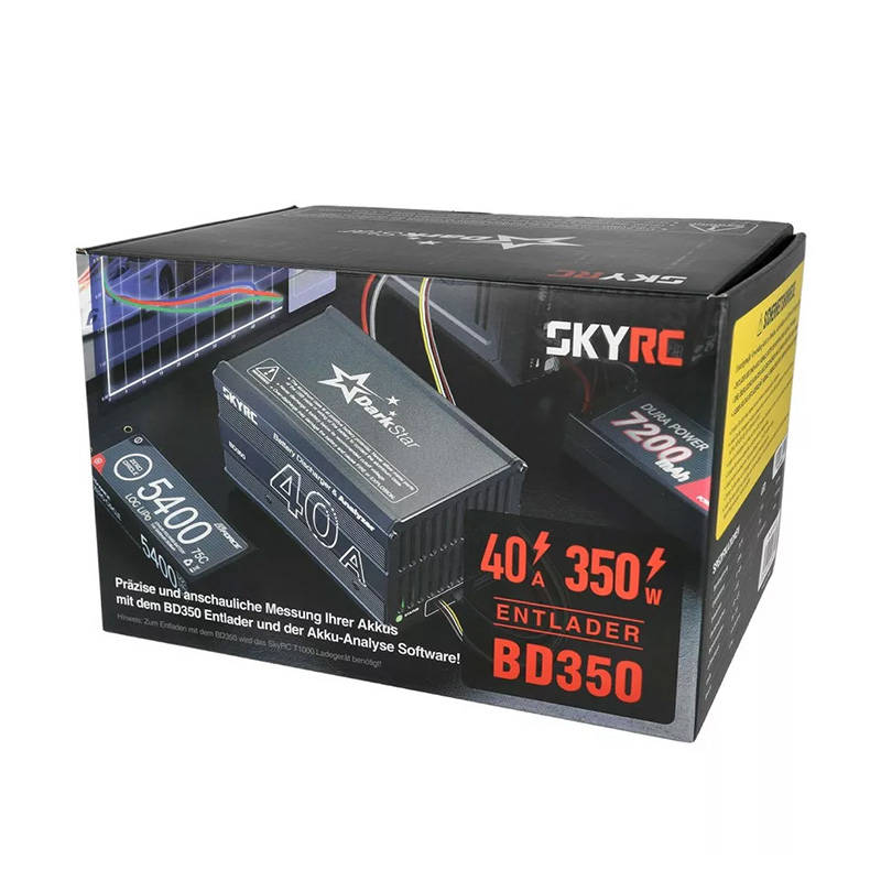 Розрядний пристрій SkyRC BD350 дозволяє легко розряджати широкий спектр акумуляторів – просто підключіть його до зарядного пристрою SkyRC T1000 Maestro. Пристрій забезпечує максимальну швидкість розряду 40 А і потужність до 350 Вт. Крім того, якщо ви додатково використовуєте програмне забезпечення Charge Master, виріб може функціонувати як надійний інструмент вимірювання. З його допомогою ви можете перевірити точну ємність і продуктивність акумулятора - завдяки цьому ви швидко визначите його можливості і підготуєтеся до наступної гонки!