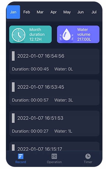 - Історія води записує деталі відкриття водяного клапана, включаючи час і кількість води, використаної для кожного поливу.