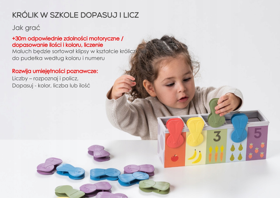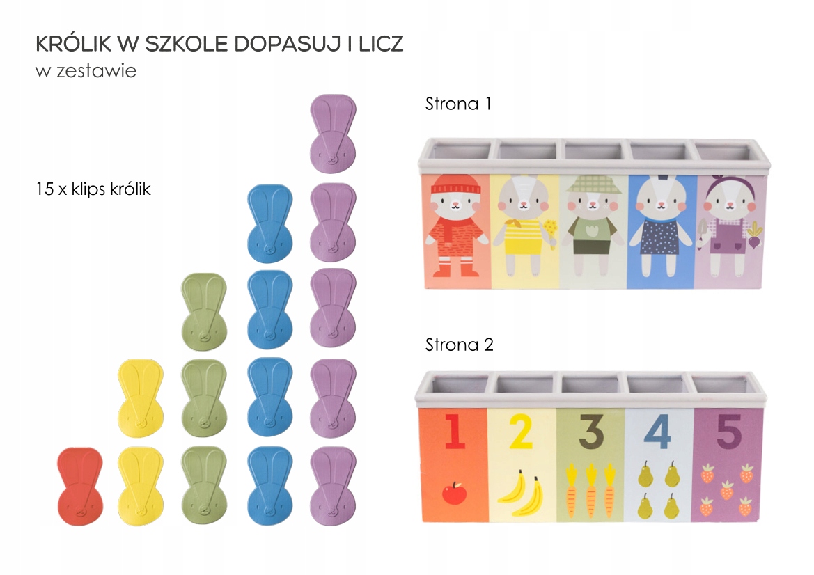 - Завдяки багатоілюстрованій коробці та 15 затискачам у формі зайчиків ця іграшка гарантовано подарує вам години розваг і освіти.