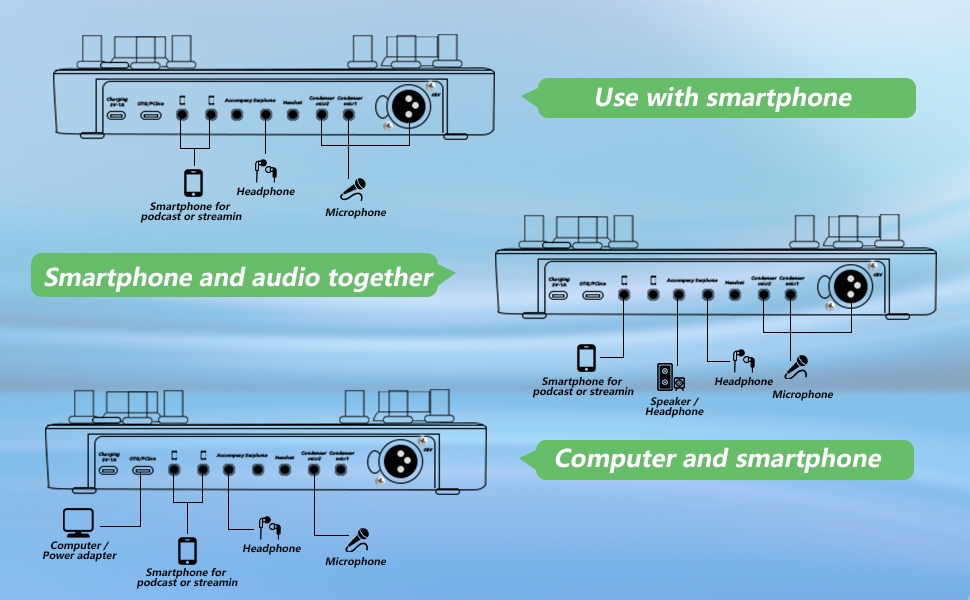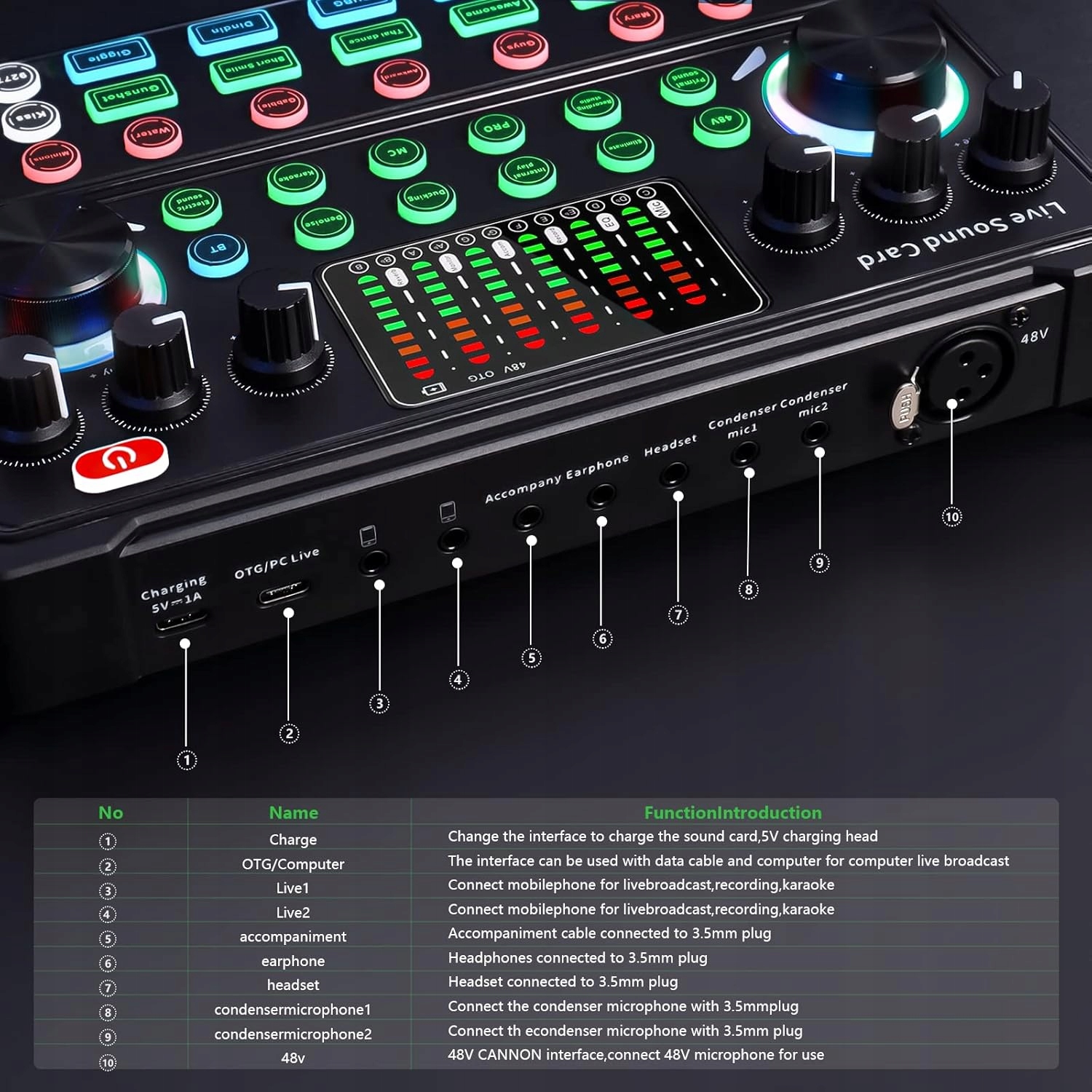 аудіо змішувач із звуковою карткою: Звукова карта оснащена професійним режимом живлення 48 В фантомного живлення, що робить якість звуку вашого мікрофона повною та детальною. Це може чітко записувати джерело звуку, дуже добре виглядати та покращити різні проблеми з високими та глибокими басами