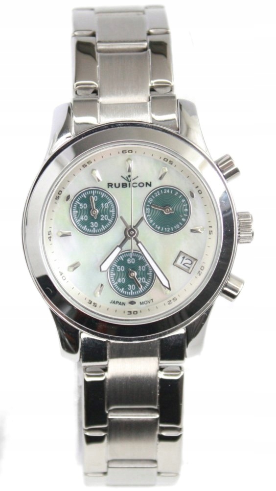 Жіночий годинник Rubicon з колекції хронограф. Браслет з нержавіючої сталі. Корпус латунний. Оснащений секундоміром і датою. Циферблат кольору, що імітує перламутр.