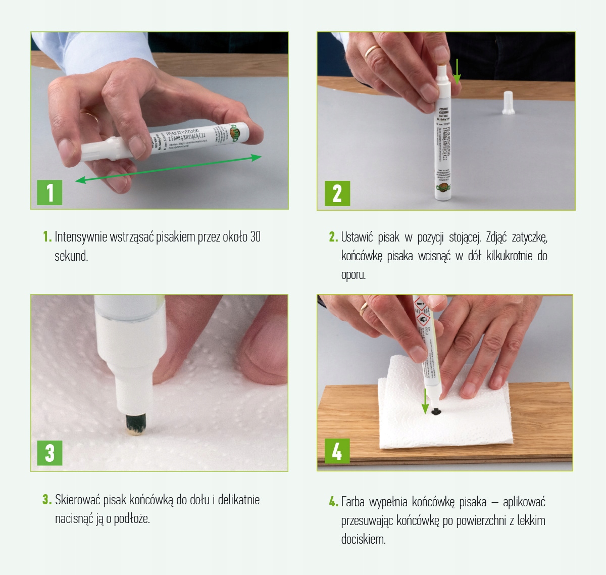 Очистіть поверхню, яку потрібно нанести, знежирте область C51 або C52 рідина, в залежності від типу поверхні. Покрийте краї або відремонтовані ділянки фарбою за допомогою ретушної ручки C22 непрозорою фарбою відповідного відтінку. Операцію можна повторити щонайменше через 15 секунд. У випадку площі матова, ви можете матувати нанесену фарбу, протерши її губкою Magic symbol C66. Надлишки фарби можна видалити за допомогою рідин C51. Відремонтована поверхня не потребує додаткового захисту.