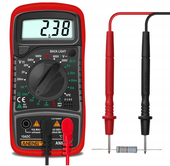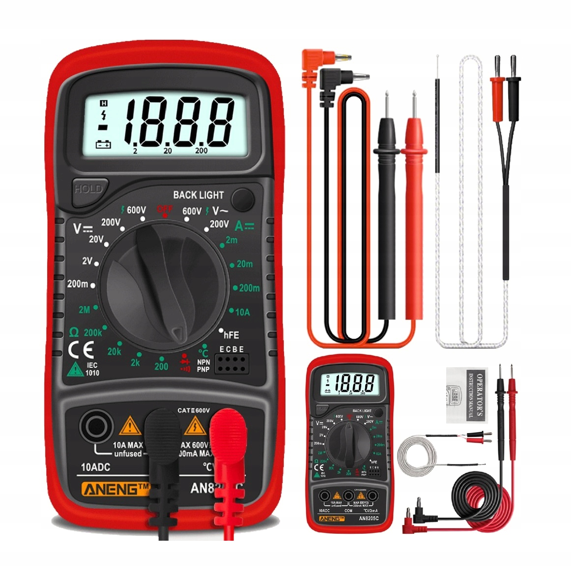 - специфікація - Вимірювання змінної напруги змінного струму в діапазоні 0-750 В; Вимірювання суцільної напруги постійного струму в діапазоні 0-1000 В; Вимірювання постійного струму постійного струму в діапазоні 0-10а; Вимірювання опору в діапазоні 0-2 Ом; Вимірювання посилення транзисторів HFE; Світлодіодний тест; низький рівень рівня акумулятора лічильника; Максимальне читання 1999 року; Поляризаційна сигналізація при вимірюванні струму та суцільної напруги; сигналізація перевищення вимірювального діапазону; Блок живлення: акумулятор; Розміри: 14x7x3.5 см; Вага: 0,125 кг; Вага в упаковці: 0,237 кг.