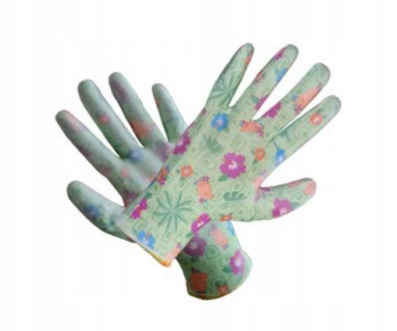Рукавички садові з покриттям з еластичної тканини з квітковим принтом. Сторона захоплення покрита безбарвним поліуретаном. Рукавички ідеально підходять для садівництва.