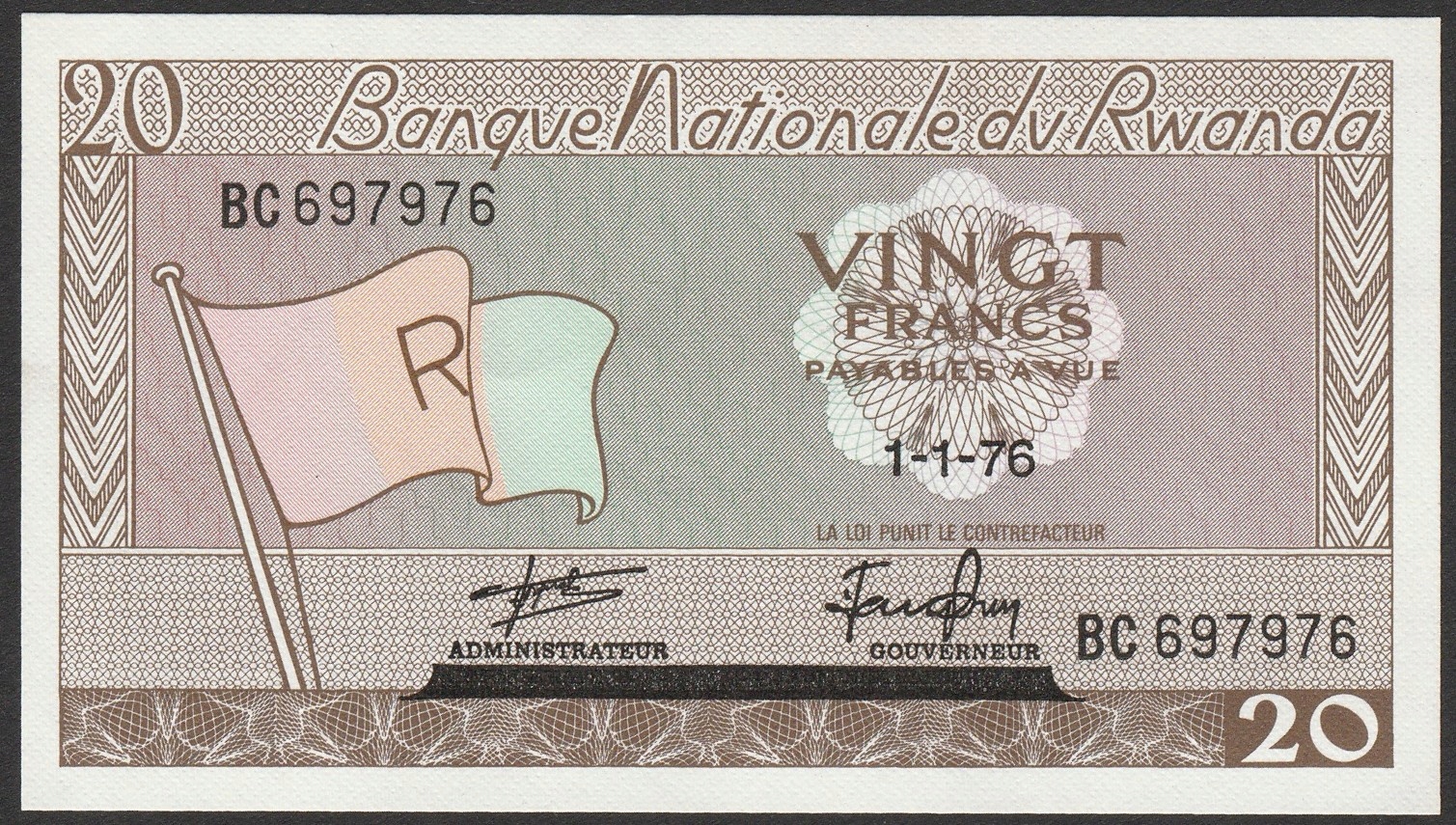 Rwanda 20 franków 1976 - BC - stan bankowy UNC