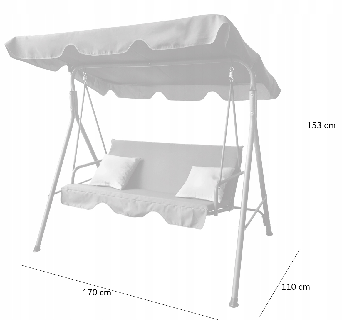 - Розміри гойдалок: Вказано на кресленні навпроти (висота до краю даху залежить від ухилу)