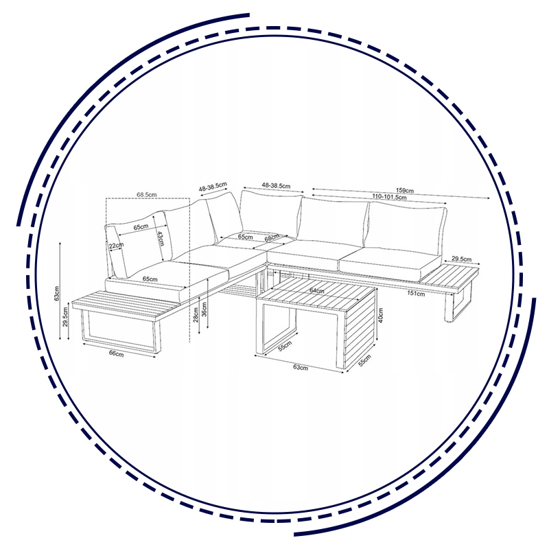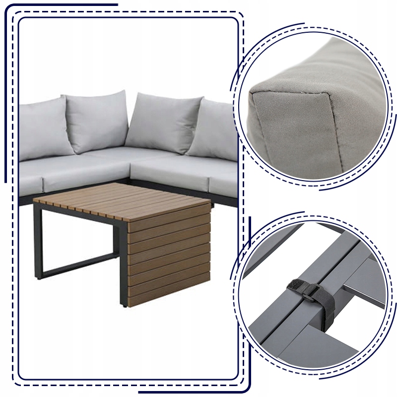 диван, що складається з трьох окремих елементів, створює зручний кут, ідеально підходить для відпочинку на відкритому повітрі. Конструкція дозволяє легко адаптувати меблі до різних домовленостей про дозвілля. Зручне сидіння було завершено подушками з поліестерами, що відрізняється більшою стійкістю до вологи , саме тому воно чудово працює у зовнішньому використанні. Додатковим елементом набору є елегантний журнальний столик з алюмінієвою рамою. Весь виглядає стильно і елегантно.