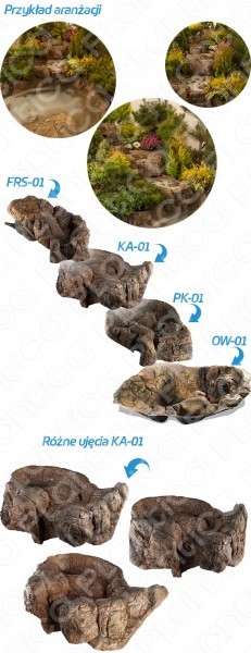 Створіть власний струмок у своєму ставку! Набір скельних елементів - це рішення для забудови струмків і струмків. Елементи виготовлені з міцної смоли, яка є надзвичайно довговічною та стійкою до погодних умов. Структура смоли ідеально імітує природні камені та гірські породи, а висока якість фарбування не дозволяє сказати, що вони є імітацією. Готові ставки або каскади значно полегшують установку ставка і забезпечують повну герметичність протягом багатьох років використання.