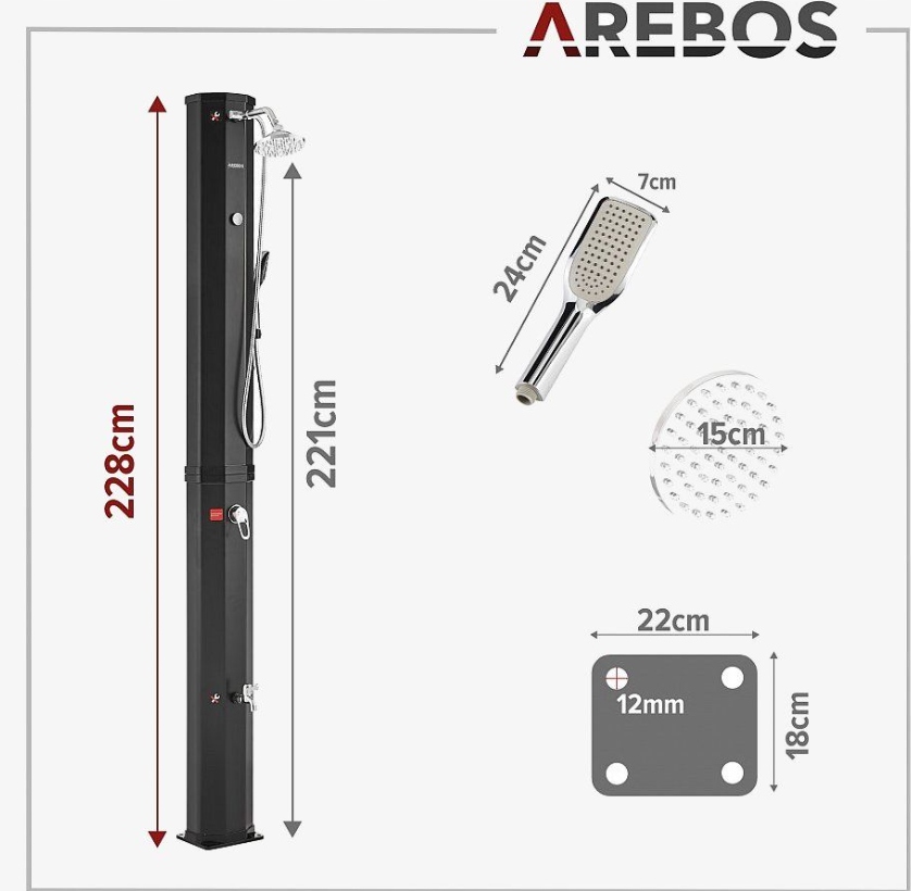 Чи мрієте ви охолодити в спекотний день без необхідності входити в будинок? А може, ви шукаєте практичне рішення у кемпінгу, біля басейну чи в саду? сонячний душ Arebos - ідеальний вибір! Завдяки сонячній енергії , зручному контролю температури та міцній конструкції , цей душ забезпечить вам комфорт та свіжість де вам це потрібно!