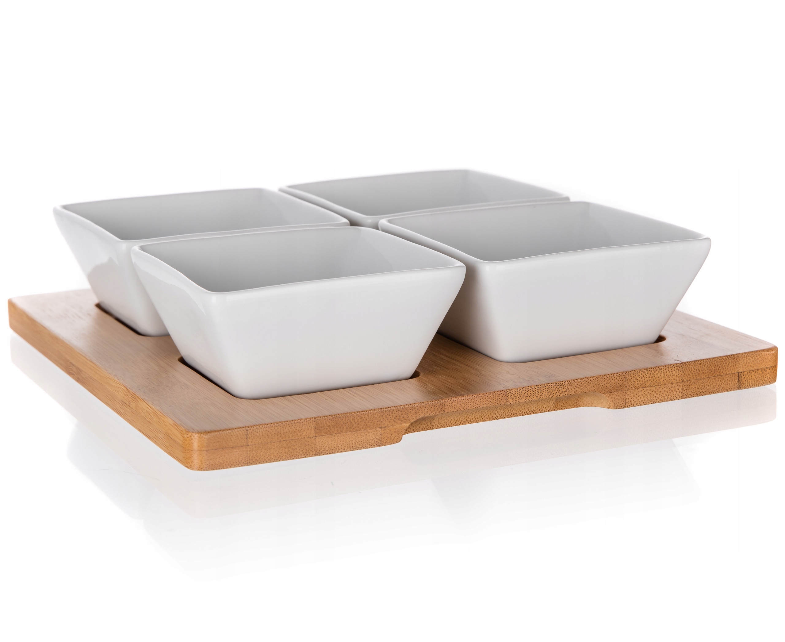 Набір з чотирьох мисок на дошці від Banquet. Чаші виготовлені з високоякісної білої порцеляни. Підставка являє собою бамбукову дошку, що відрізняється довговічністю. Делікатні канавки в дошці не дозволяють чашкам вислизати з дошки. Закуски (чіпси, батат, горіхи, фрукти тощо) і соуси можна подавати в мисках. Дет чудово виглядає на столі. Ідеально підходить для будь-якого свята, як вдома, так і в ресторані.