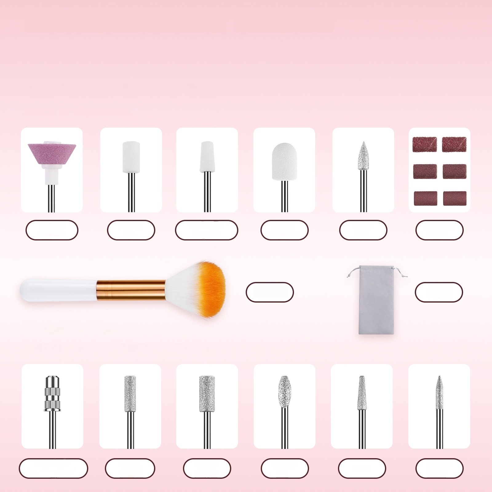 ✅1 x Електричний файл нігтів 11 x Шліфувальні головки 31 x Потертості 1 мішок 1 x чистка кисті 1 x зарядний кабель 1 x посібник користувача 1 x барвистий коробка