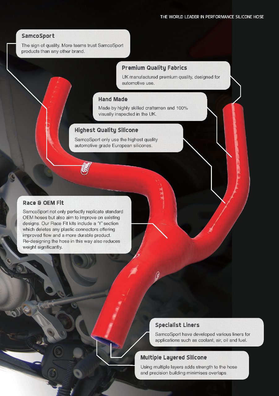 Samco Sport вже понад 10 років є світовим лідером у виробництві ефективних силіконових шлангів, постачаючи продукцію командам F1, NASCAR, WRC і WSBK. Асортимент комплектів шлангів і аксесуарів для перегонів неперевершений.