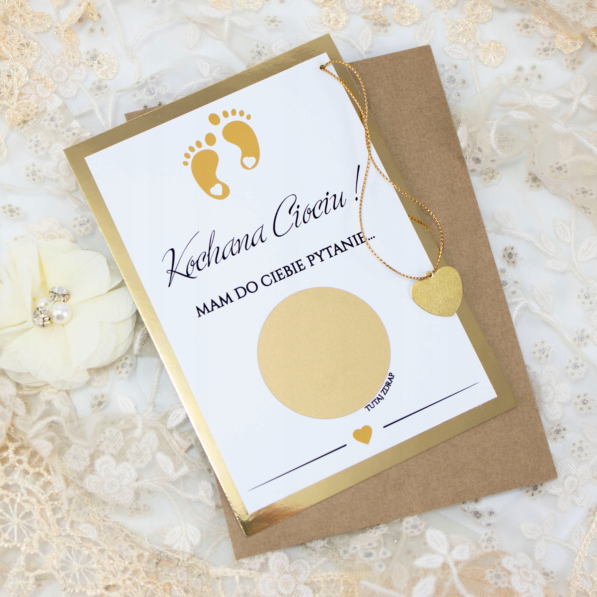 Оригінальна ідея, щоб запитати кохану людину про те, щоб стати хрещеною мамою. Листівка постачається з милим маленьким золотим сердечком, яке можна зішкребти. Під золотою скретч-карткою є приховане запитання: «Чи станеш ти моїм хрещеним батьком?».