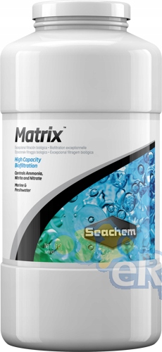 Матриця - це фільтрування з високою пористістю, що забезпечує ефективне видалення продуктів метаболізму азоту. Діаметр одного зерна становить приблизно 10 мм, а їх загальна поверхня в одному літі вище 700 м2, що відповідає 170 літрів пластикових біобаллі. Завдяки своїй структурі Matrix дозволяє мікроорганізмам встановлюватись як в більш дрібній, так і в глибшій частині пор. Крім того, вони є оптимальними для бактерій нітрифікації та денітрифікації. Це дозволяє одночасно позбутися нітратів, нітритів та аміаку. Матриця хімічно байдужа і не руйнується. Вам не потрібно його замінювати. Оскільки більшість бактерій населяють внутрішню частину пор, при необхідності гранули можна промити. Матриця підходить для використання у всіх типах фільтрів.