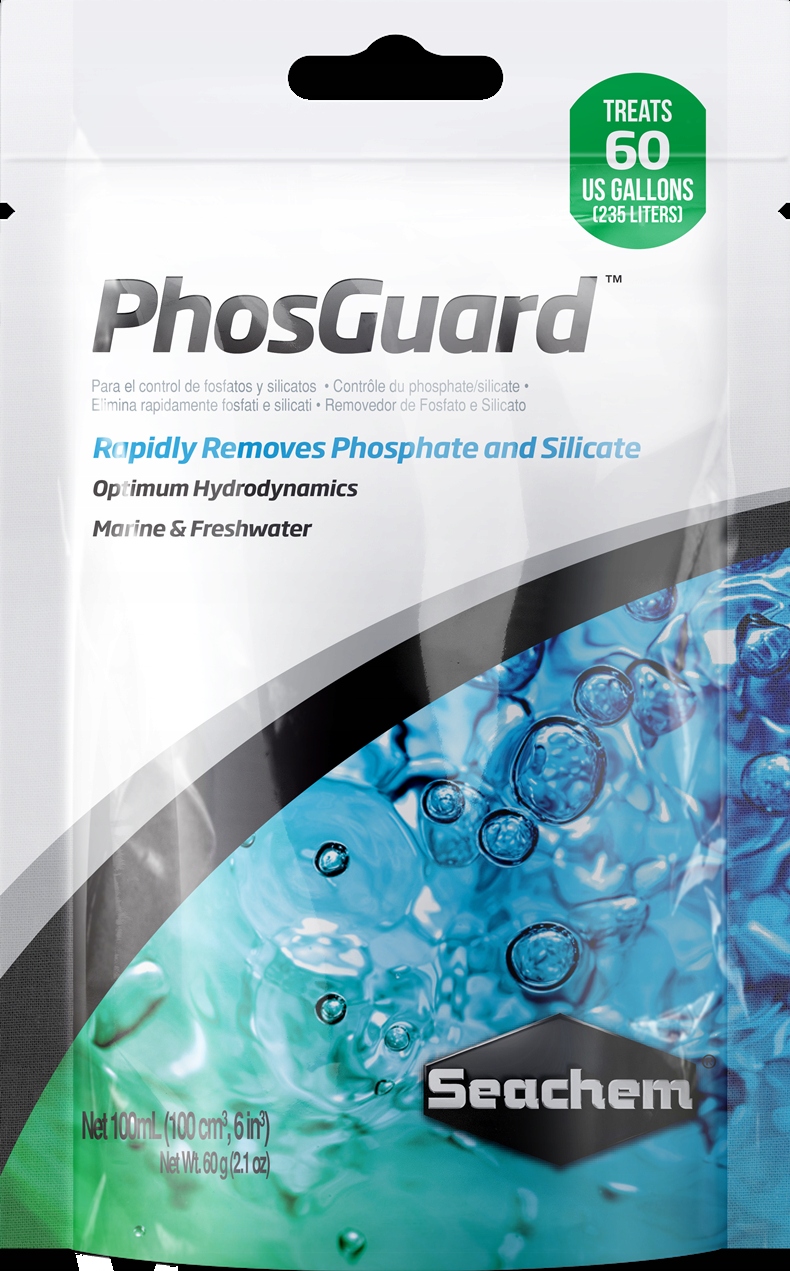 phosguard швидко та ефективно видаляє фосфатів та силікатів із прісноводних та морських акваріумів. Не рекомендується використовувати його в прісній воді, заокущеній з фосфорними сполуками. Підготовка має форму пористих гранул, що збільшує поверхню її контакту з водою. Сферична форма частинок Phosguard забезпечує оптимальний потік води між ними після розміщення продукту в камеру фільтрації. Конкурентні препарати, як правило, скупчуються завдяки нерегулярній формі зерен, що обмежує їх здатність видаляти фосфати. Phosguard - єдиний на ринку у вигляді куль. ВАЖЛИВО: Оксид алюмінію не відновлюється, і нагрівання його в духовці не відновлює її здатність до очищення фосфату. Причиною цього непорозуміння є промислове використання оксиду алюмінію для сушіння повітря. Дійсно, накопичену вологу найпростіше видаляється нагріванням, але це не може видалити захоплені хімічні речовини.