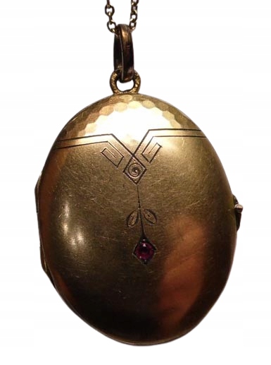 SECECSION OPEN СЕКРЕТАР МЕДАЛЬЙОН РУБІНОВИЙ КАМІНЬ. Позолочений кулон - позолочений (жовтий метал, ймовірно латунь) Розміри секретера: 2,37 х 3,07 сантиметра, "висота" 6,55 мм. Загальна довжина з підвісною ручкою 4 см. На лицьовій стороні гравірування і камінь, схожий на рубін. Всередині є місце для фотографій або інших мініатюрних предметів (оригінальні ювелірні вироби 1890 - 1920 років).