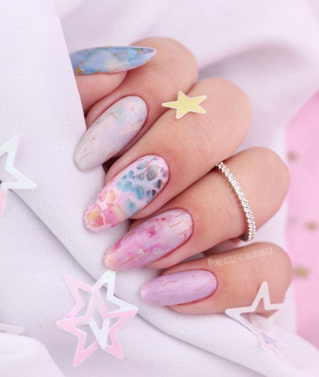 Переказну фольгу Blue Marble Semilac можна нанести на весь ніготь або створити з неї візерунки певної форми - вибирайте, що Ви віддаєте перевагу. Синю перекладну фольгу найкраще поєднувати з білою, відтінками м'яти і сірого. Фольга надає стилізації нігтів елегантності, а її неочевидний візерунок, сповнений абстрактної глибини, також привертає увагу в яскравих синіх і м’ятних відтінках. Він чудово працює як невеликий елемент для укладання навіть на одному нігті.