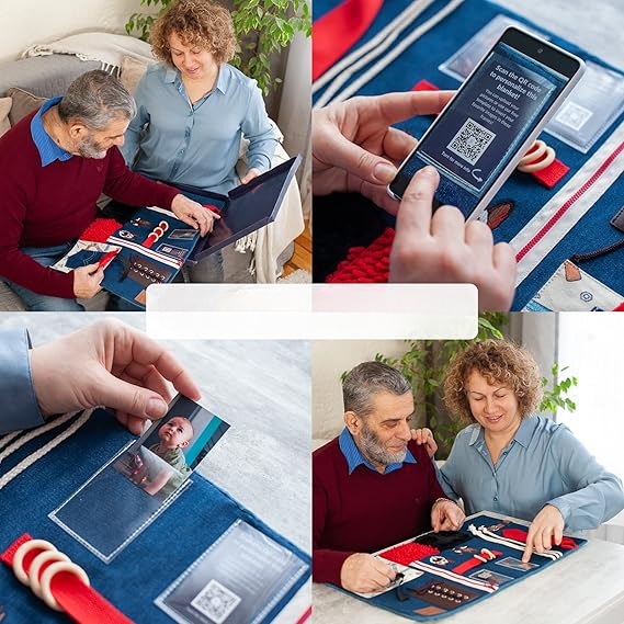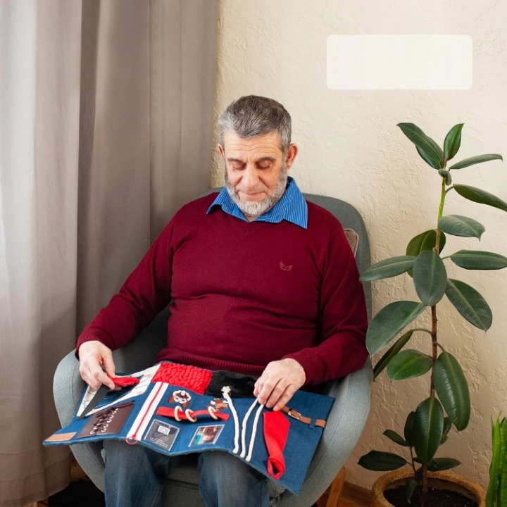 Наша сенсорна ковдра була ретельно розроблена і пропонує різні рівні труднощів, що робить її ідеальною для людей похилого віку на кожному етапі деменції. Різні заходи допоможуть зняти тривогу і безпечно та спокійно захопити руки. Фото -рамки дозволяють персоналізувати ковдру, як вам подобається!