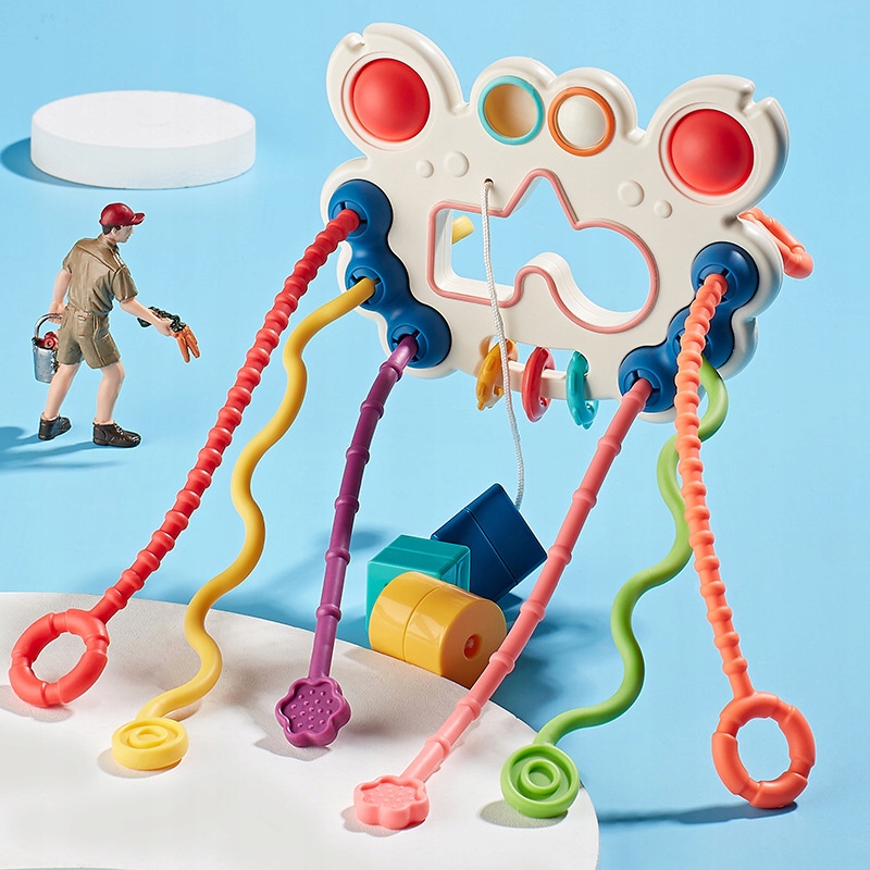 Струни можуть бути шипованими або гладкими, що додає взаємодії та різноманітності у гру. Кожна нитка має різний колір, що допомагає розвинути у дитини розпізнавання кольорів. Ваш малюк може спостерігати та порівнювати кольори та вивчати назви кольорів під час гри з крабом.
